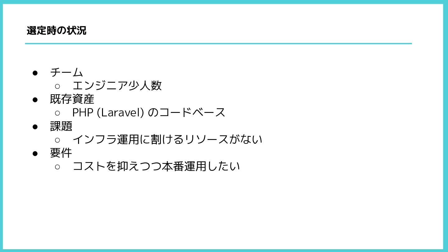 • 課題 ◦ インフラ運用に割けるリソースがない • 要件 ◦ コストを抑えつつ本番運用したい 選定時の状況