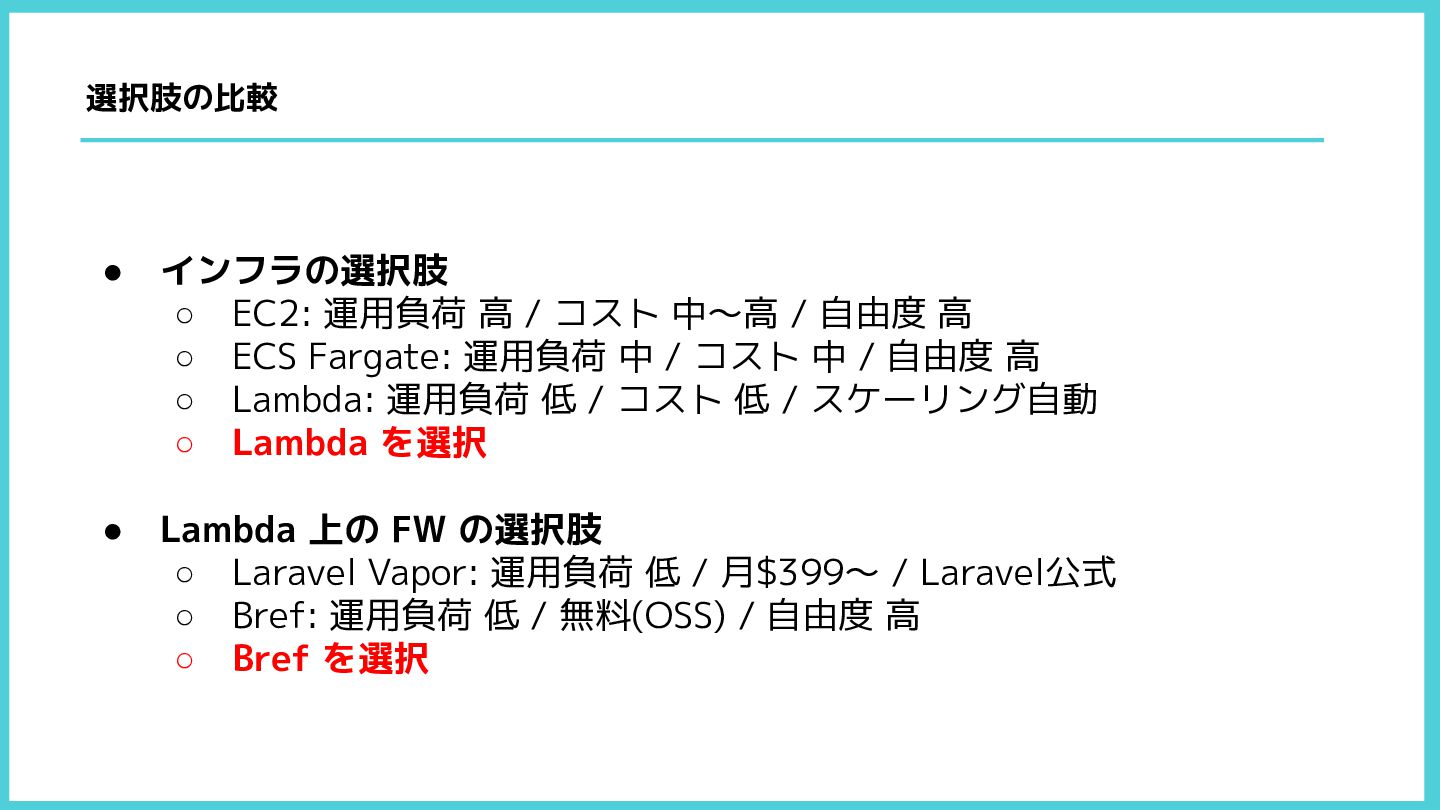 自由度 高 ◦ ECS Fargate: 運用負荷 中 / コスト 中 / 自由度 高 ◦ Lambda: 運用負荷 低 / コスト 低 / スケーリング自動 ◦ Lambda を選択 • Lambda 上の FW の選択肢 ◦ Laravel Vapor: 運用負荷 低 / 月$399〜 / Laravel公式 ◦ Bref: 運用負荷 低 / 無料(OSS) / 自由度 高 ◦ Bref を選択 選択肢の比較