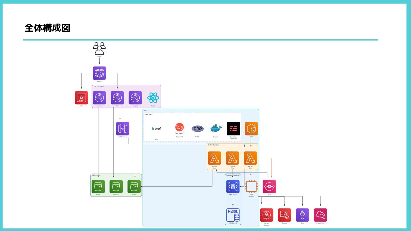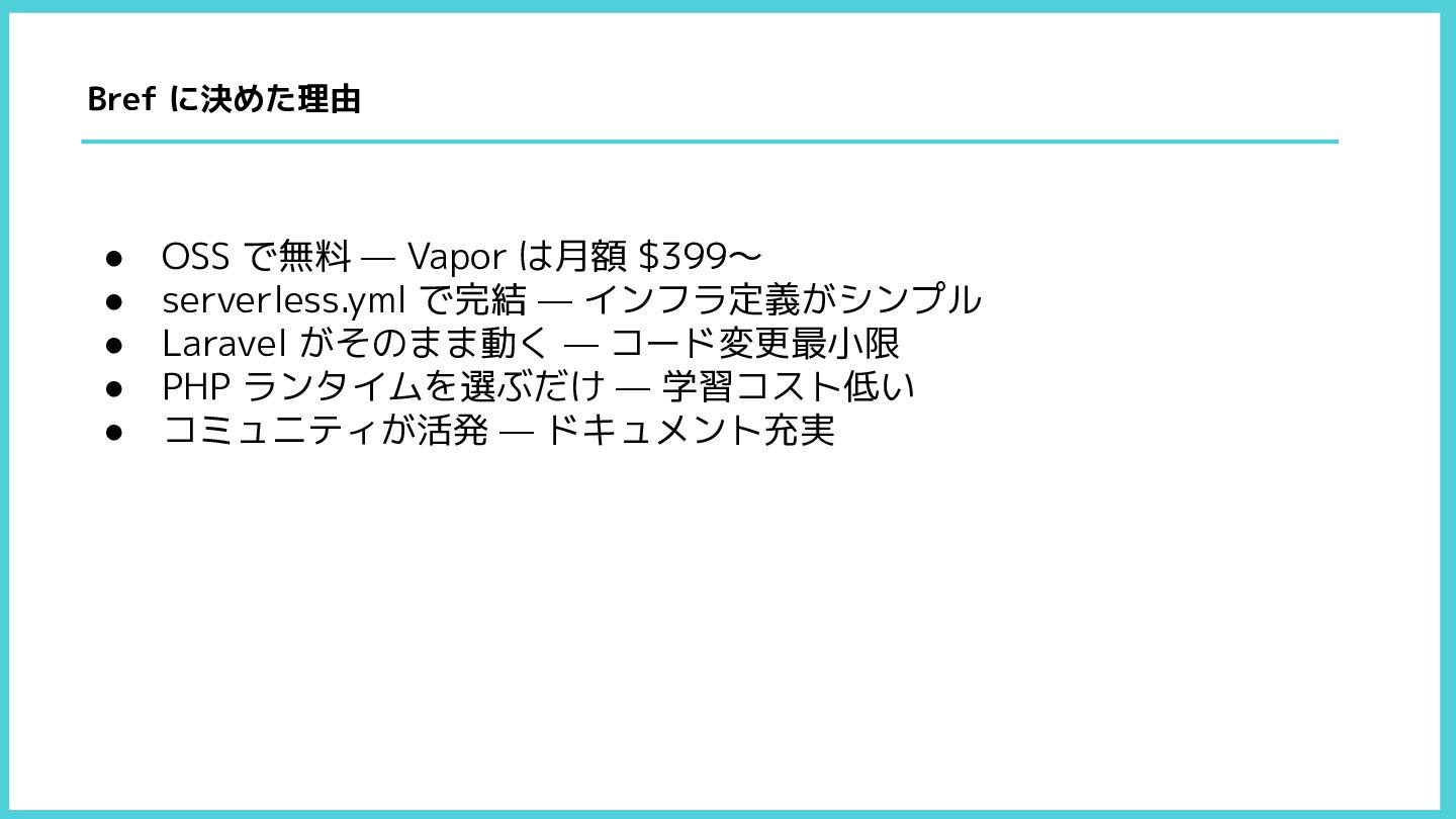 — インフラ定義がシンプル • Laravel がそのまま動く — コード変更最小限 • PHP ランタイムを選ぶだけ — 学習コスト低い • コミュニティが活発 — ドキュメント充実 Bref に決めた理由