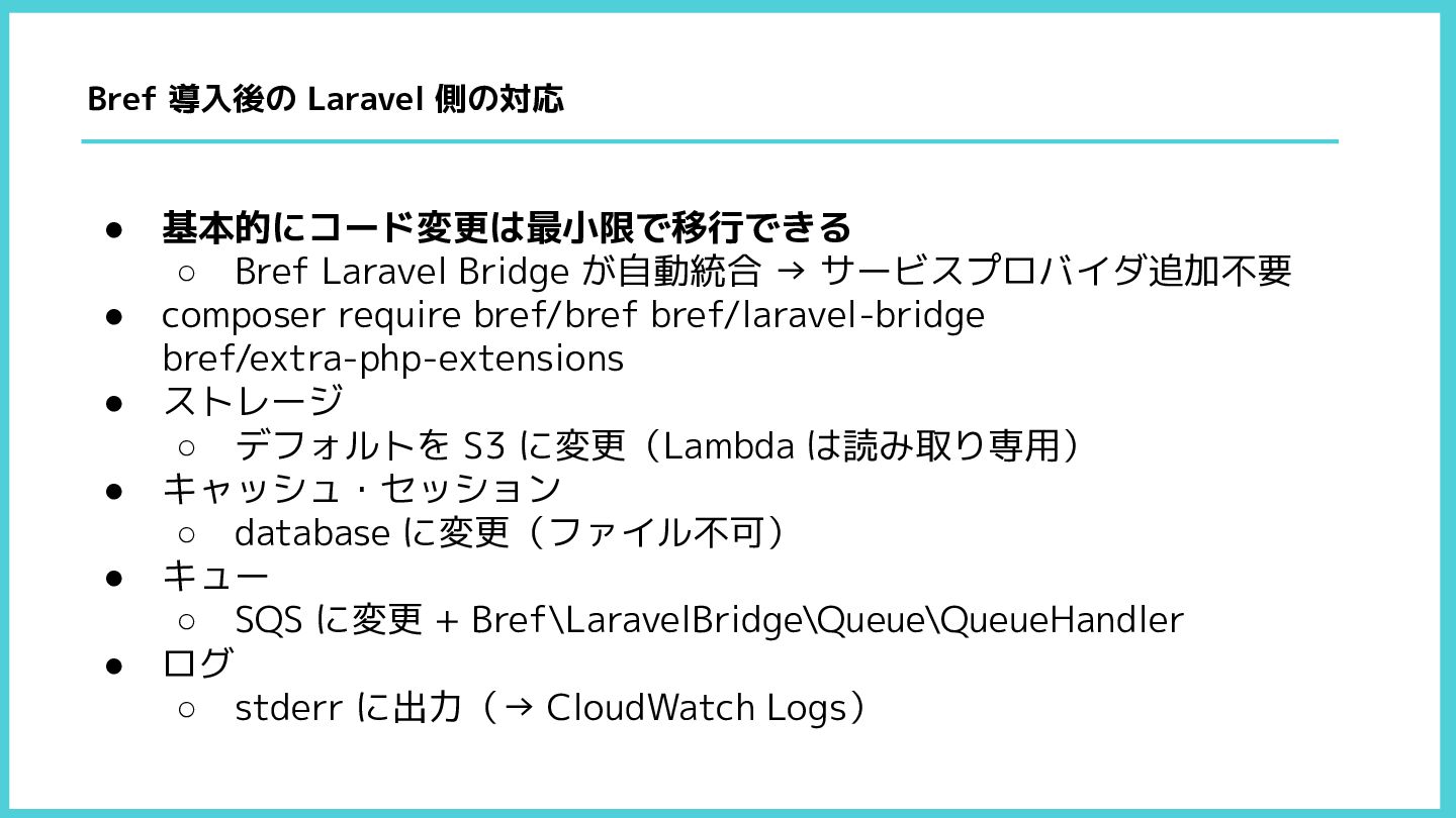 • 基本的にコード変更は最小限で移行できる ◦ Bref Laravel Bridge が自動統合 → サービスプロバイダ追加不要 •