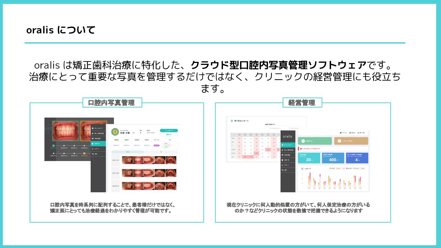 oralis は矯正歯科治療に特化した、クラウド型口腔内写真管理ソフトウェアです。 治療にとって重要な写真を管理するだけではなく、クリニックの経営管理にも役立ち ます。 oralis について 口腔内写真管理 経営管理 口腔内写真を時系列に配列することで、患者様だけではなく、 矯正医にとっても治療経過をわかりやすく管理が可能です。