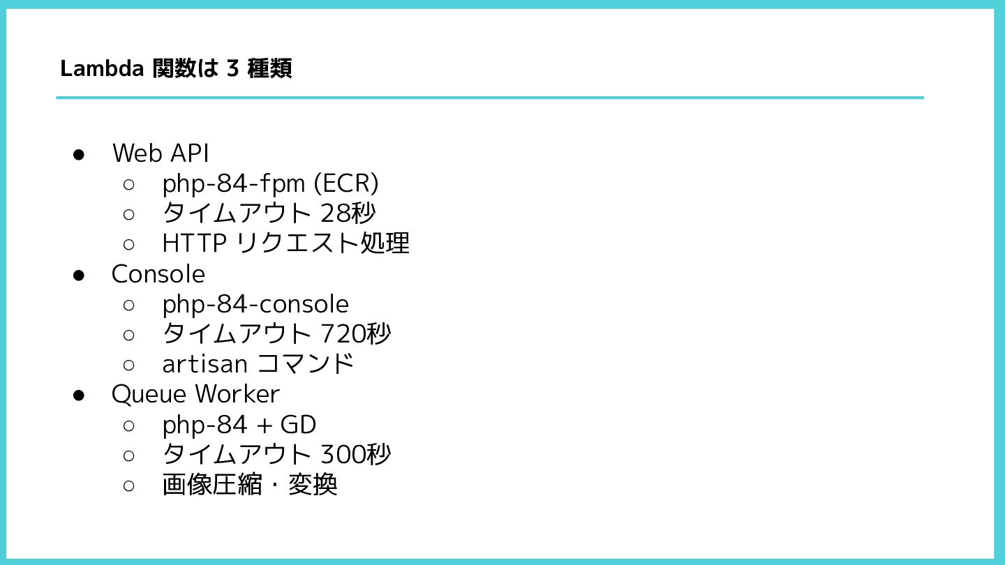 HTTP リクエスト処理 • Console ◦ php-84-console ◦ タイムアウト 720秒 ◦ artisan コマンド • Queue Worker ◦ php-84 + GD ◦ タイムアウト 300秒 ◦ 画像圧縮・変換 Lambda 関数は 3 種類