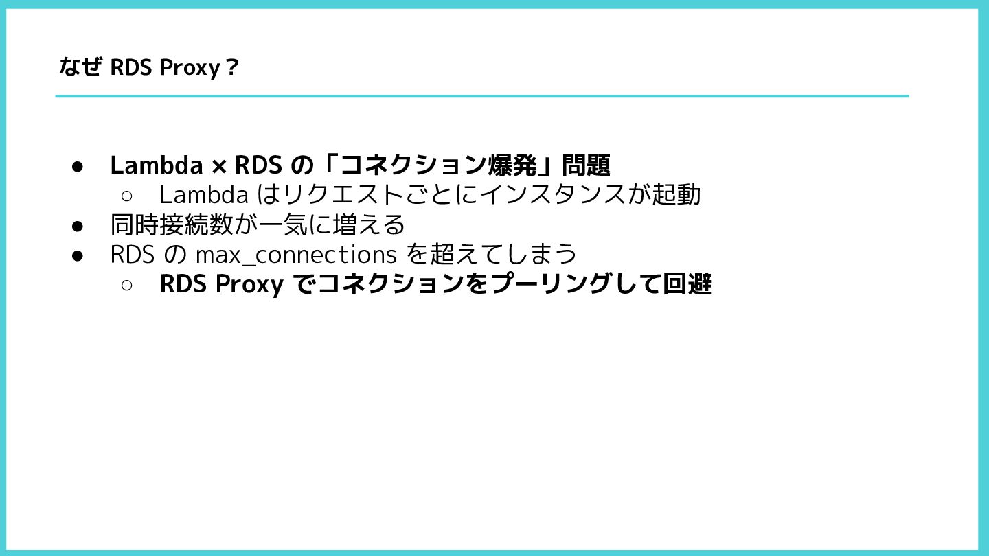 • RDS の max_connections を超えてしまう ◦ RDS Proxy でコネクションをプーリングして回避 なぜ RDS Proxy?
