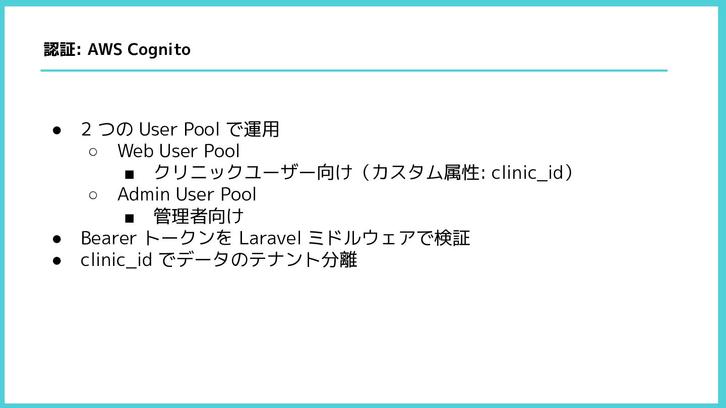 ▪ クリニックユーザー向け(カスタム属性: clinic_id) ◦ Admin User Pool ▪ 管理者向け • Bearer トークンを Laravel ミドルウェアで検証 • clinic_id でデータのテナント分離 認証: AWS Cognito