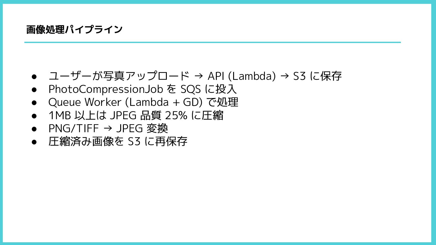 を SQS に投入 • Queue Worker (Lambda + GD) で処理 • 1MB 以上は JPEG 品質 25% に圧縮 • PNG/TIFF → JPEG 変換 • 圧縮済み画像を S3 に再保存 画像処理パイプライン