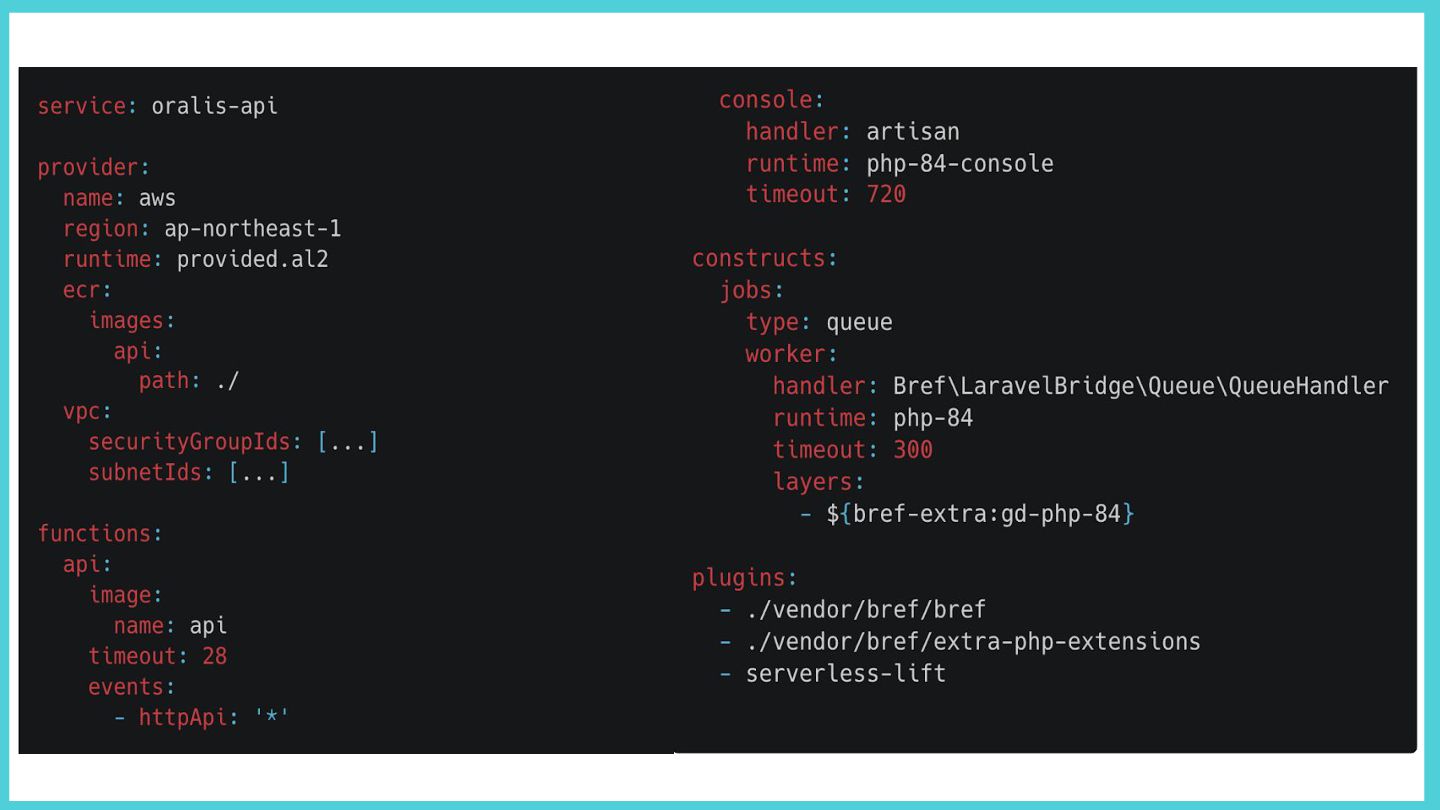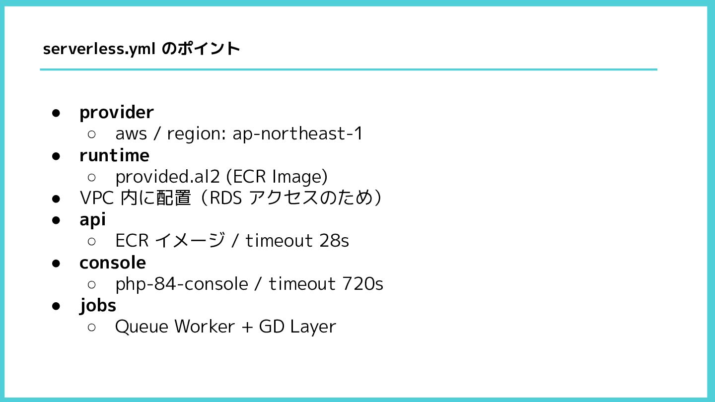 provided.al2 (ECR Image) • VPC 内に配置(RDS アクセスのため) • api ◦ ECR イメージ / timeout 28s • console ◦ php-84-console / timeout 720s • jobs ◦ Queue Worker + GD Layer serverless.yml のポイント