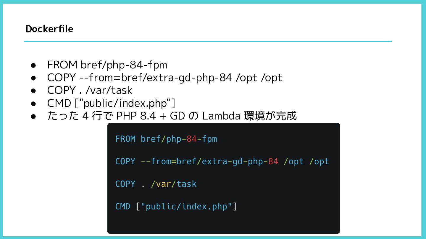 . /var/task • CMD ["public/index.php"] • たった 4 行で PHP 8.4 + GD の Lambda 環境が完成 Dockerfile
