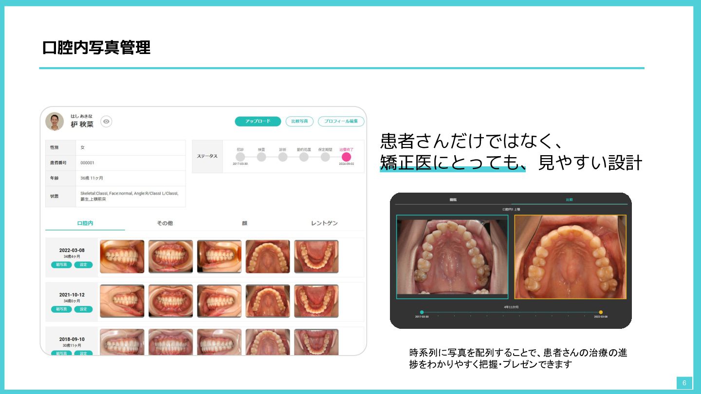 口腔内写真管理 6 患者さんだけではなく、 矯正医にとっても、見やすい設計 時系列に写真を配列することで、患者さんの治療の進 捗をわかりやすく把握・プレゼンできます