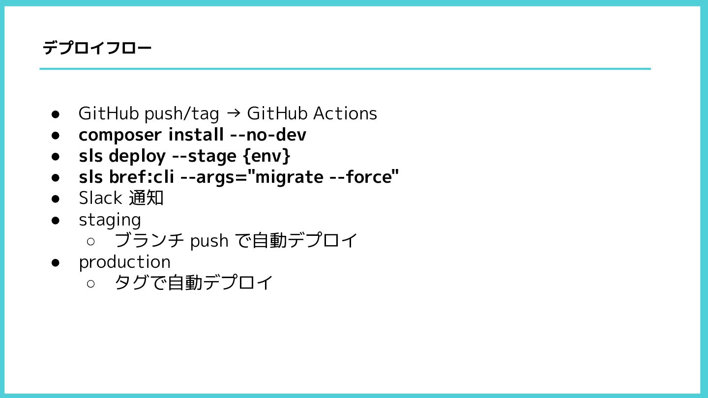 • sls deploy --stage {env} • sls bref:cli --args="migrate --force" • Slack 通知 • staging ◦ ブランチ push で自動デプロイ • production ◦ タグで自動デプロイ デプロイフロー