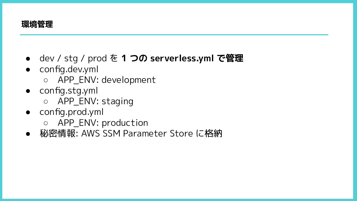 で管理 • config.dev.yml ◦ APP_ENV: development • config.stg.yml ◦ APP_ENV: staging • config.prod.yml ◦ APP_ENV: production • 秘密情報: AWS SSM Parameter Store に格納 環境管理