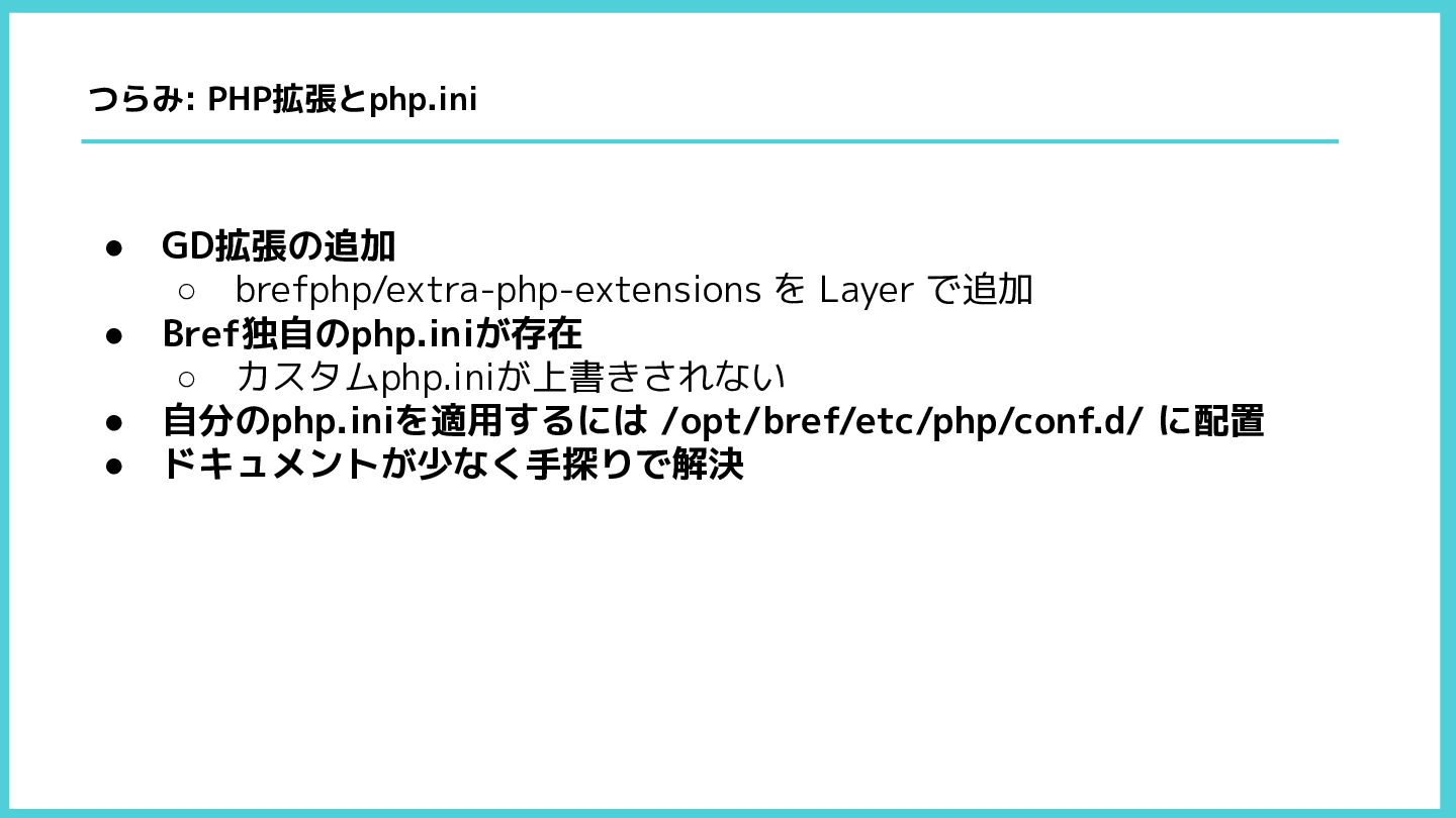 • GD拡張の追加 ◦ brefphp/extra-php-extensions を Layer で追加 • Bref独自のphp.iniが存在 ◦