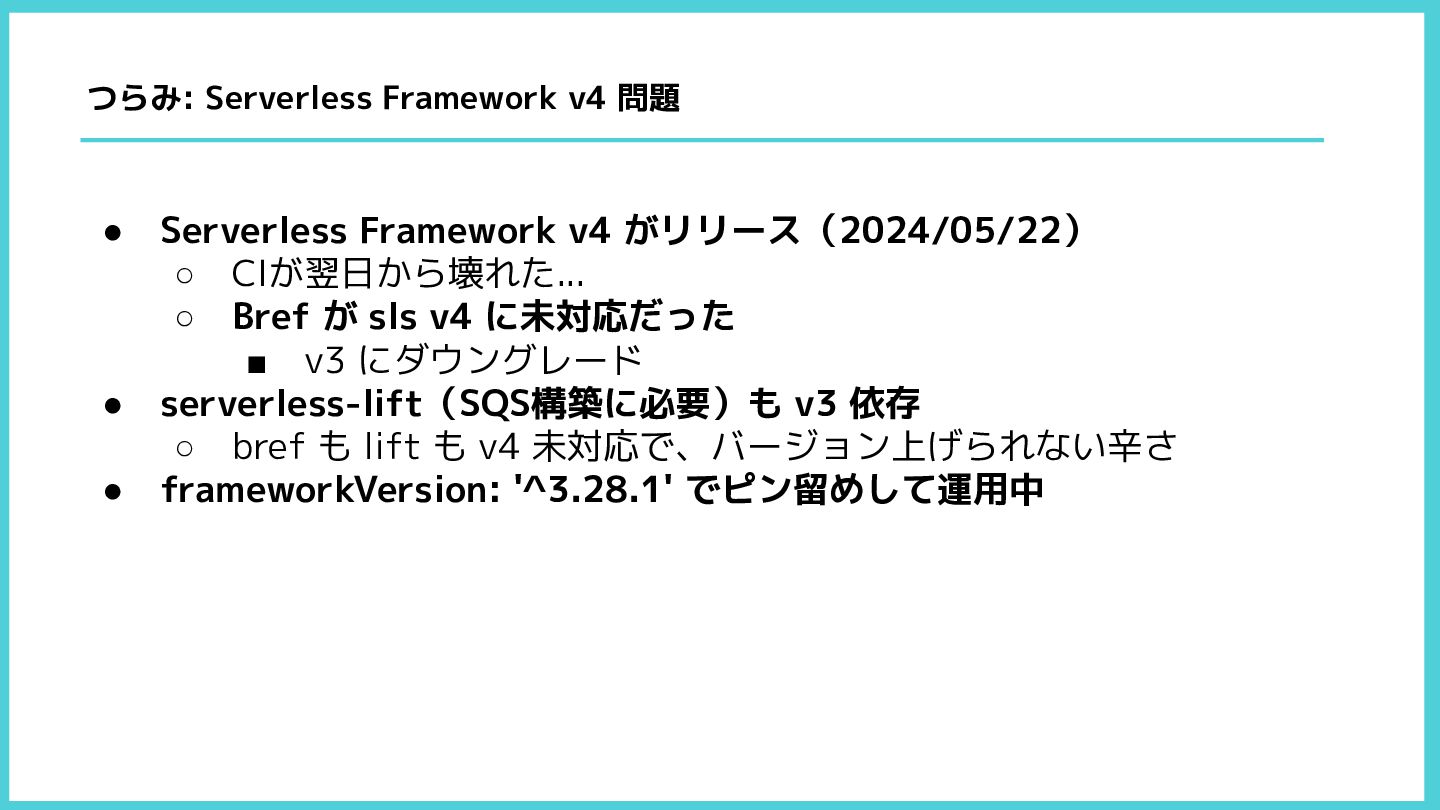 sls v4 に未対応だった ▪ v3 にダウングレード • serverless-lift(SQS構築に必要)も v3 依存 ◦ bref も lift も v4 未対応で、バージョン上げられない辛さ • frameworkVersion: '^3.28.1' でピン留めして運用中 つらみ: Serverless Framework v4 問題