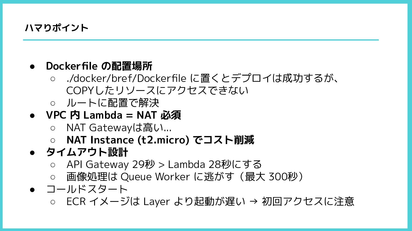 VPC 内 Lambda = NAT 必須 ◦ NAT Gatewayは高い... ◦ NAT Instance (t2.micro) でコスト削減 • タイムアウト設計 ◦ API Gateway 29秒 > Lambda 28秒にする ◦ 画像処理は Queue Worker に逃がす(最大 300秒) • コールドスタート ◦ ECR イメージは Layer より起動が遅い → 初回アクセスに注意 ハマりポイント