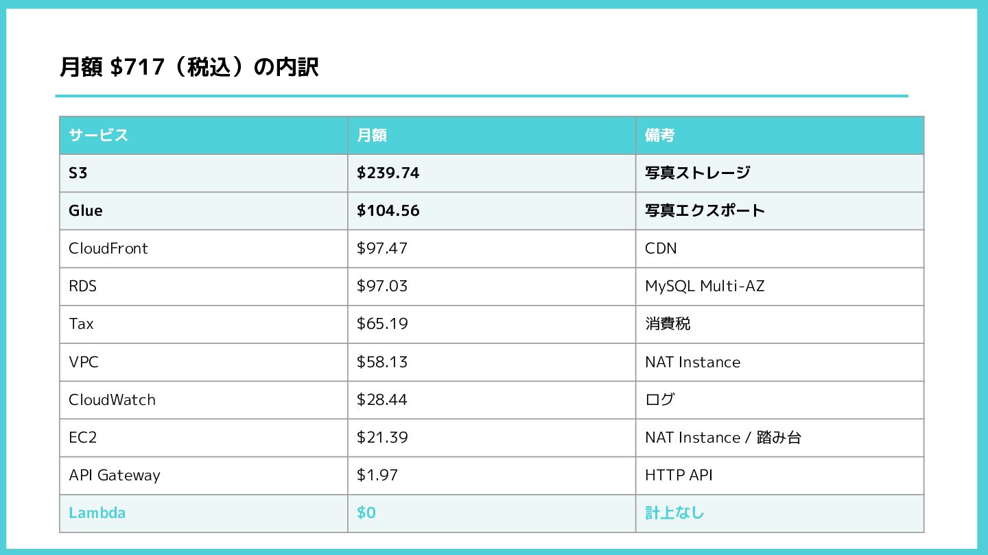 写真エクスポート CloudFront $97.47 CDN RDS $97.03 MySQL Multi-AZ Tax $65.19 消費税 VPC $58.13 NAT Instance CloudWatch $28.44 ログ EC2 $21.39 NAT Instance / 踏み台 API Gateway $1.97 HTTP API Lambda $0 計上なし