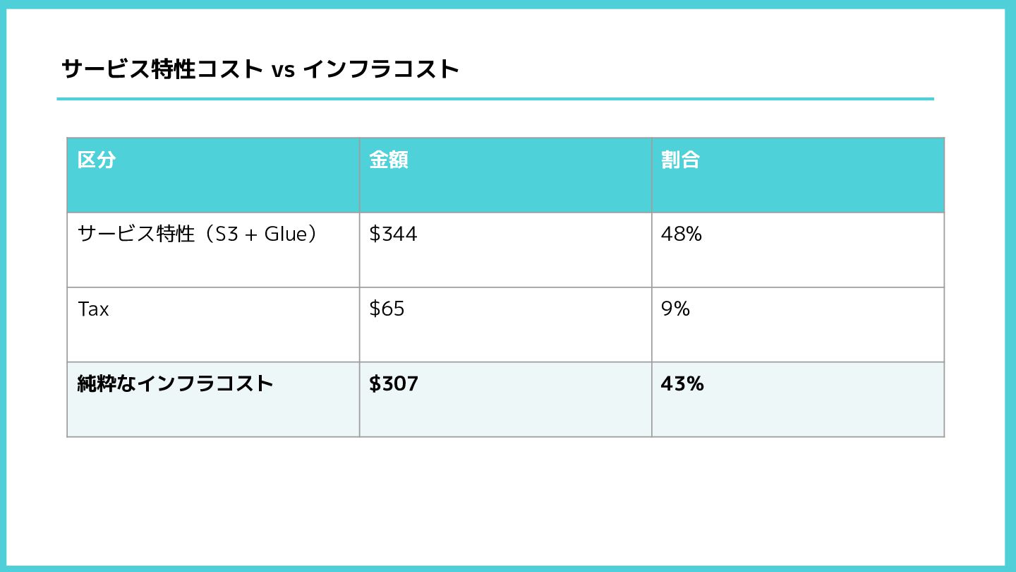サービス特性コスト vs インフラコスト 区分 金額 割合 サービス特性(S3 + Glue) $344