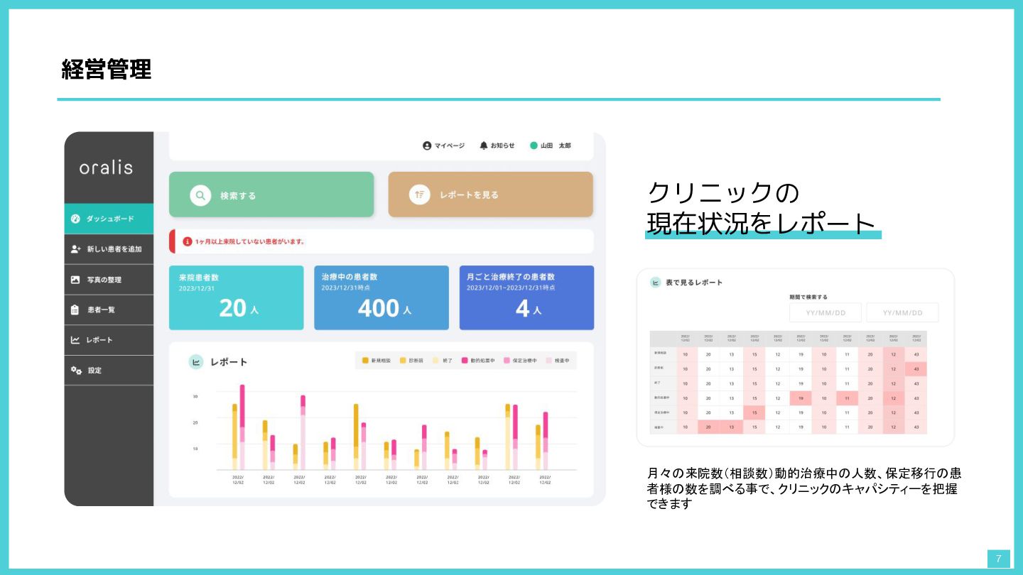 経営管理 7 クリニックの 現在状況をレポート 月々の来院数(相談数)動的治療中の人数、保定移行の患 者様の数を調べる事で、クリニックのキャパシティーを把握 できます