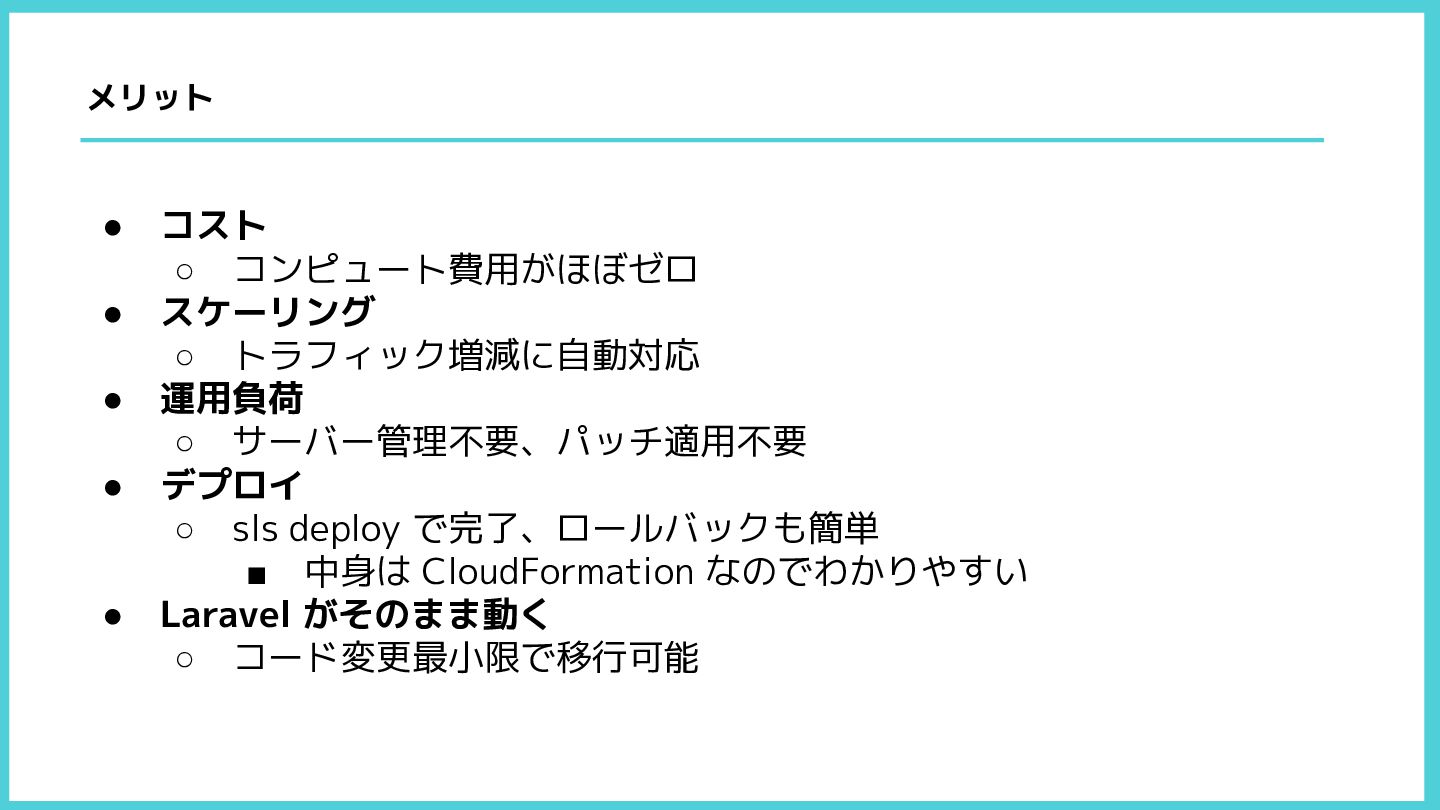 ◦ サーバー管理不要、パッチ適用不要 • デプロイ ◦ sls deploy で完了、ロールバックも簡単 ▪ 中身は CloudFormation なのでわかりやすい • Laravel がそのまま動く ◦ コード変更最小限で移行可能 メリット