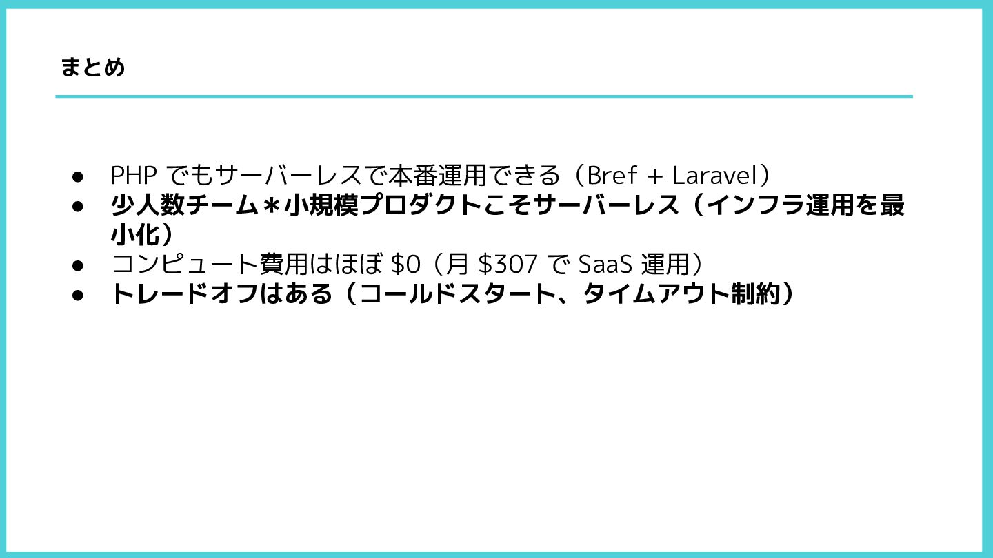 • PHP でもサーバーレスで本番運用できる(Bref + Laravel) • 少人数チーム*小規模プロダクトこそサーバーレス(インフラ運用を最 小化) • コンピュート費用はほぼ