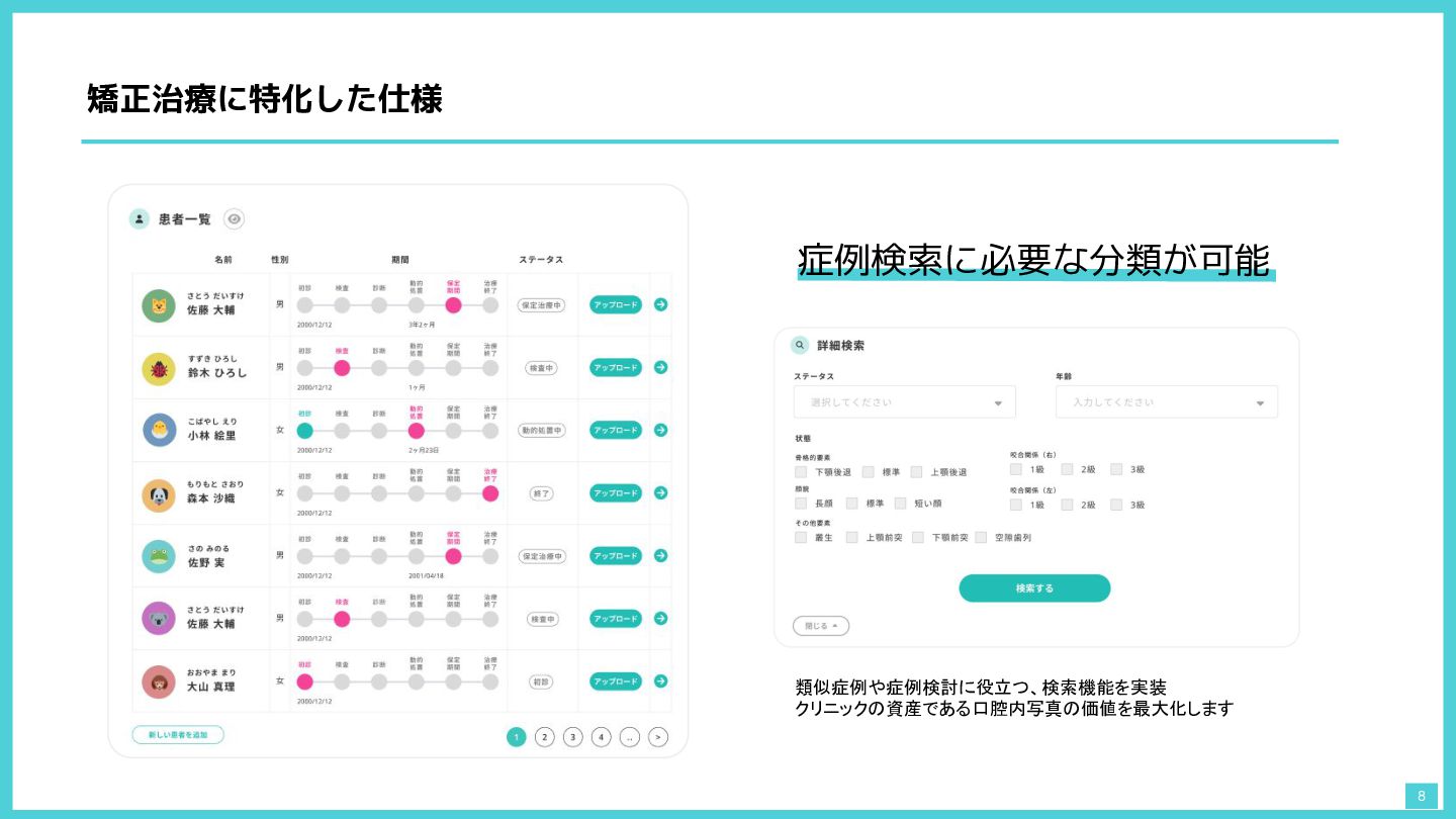 矯正治療に特化した仕様 8 症例検索に必要な分類が可能 類似症例や症例検討に役立つ、検索機能を実装 クリニックの資産である口腔内写真の価値を最大化します