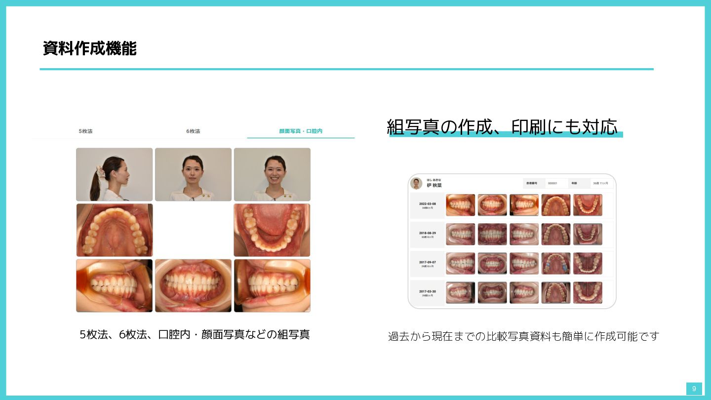 資料作成機能 9 組写真の作成、印刷にも対応 過去から現在までの比較写真資料も簡単に作成可能です 5枚法、6枚法、口腔内・顔面写真などの組写真