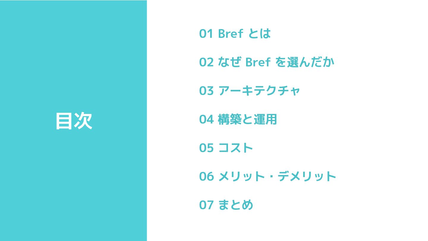 目次 01 Bref とは 02 なぜ Bref を選んだか 03 アーキテクチャ