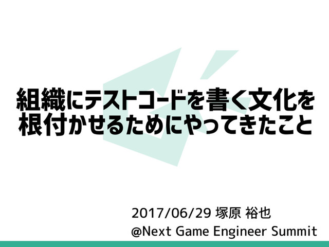 組織にテストコードを書く文化を 根付かせるためにやってきたこと 2017/06/29 塚原 裕也 @Next Game Engineer Summit