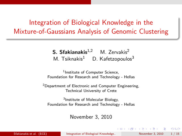 sparse structure of the cov. matrix is imposed on every component of the mixture model so that component densities are rewritten as fi (x x xj ;θi θi θi ) = N(x x xj ;µ µ µi ,Σ Σ Σi ) (7) and then taking into account the block diagonal structure we get a factorization of the form: fi (x x xj ;θi θi θi ) = N(x x x(r) j ;µ µ µ(r) i ,D D D(r) i ) K ∏ k=1 N(x x x(k) j ;µ µ µ(k) i ,Σ Σ Σ(k) i ) (8) and the mixture density becomes: f (x x xj ;Θ Θ Θ) = g ∑ i=1 πi N(x x x(r) j ;µ µ µ(r) i ,D D D(r) i ) · K ∏ k=1 N(x x x(k) j ;µ µ µ(k) i ,Σ Σ Σ(k) i ) = g ∑ i=1 πi K+1 ∏ k=1 N(x x x(k) j ;µ µ µ(k) i ,Σ Σ Σ(k) i ) (9) Sfakianakis et al. (ECE) Integration of Biological Knowledge.. November 3, 2010 7 / 15