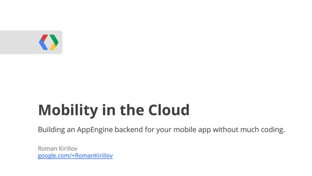 (package name from manifest) Registration ID (issued by GCM to each device) [email protected] AIzzSmq78hIOlwUU4nq8dD (Server API key) Registration ID (issued by GCM to each device) Listen to whom? Who wants to listen? Who’s talking? Identifies an instance of app on the server Speaking to whom? cool-beanbag-383.appspot.com (Application URL) “cool-beanbag-383” (Project ID)