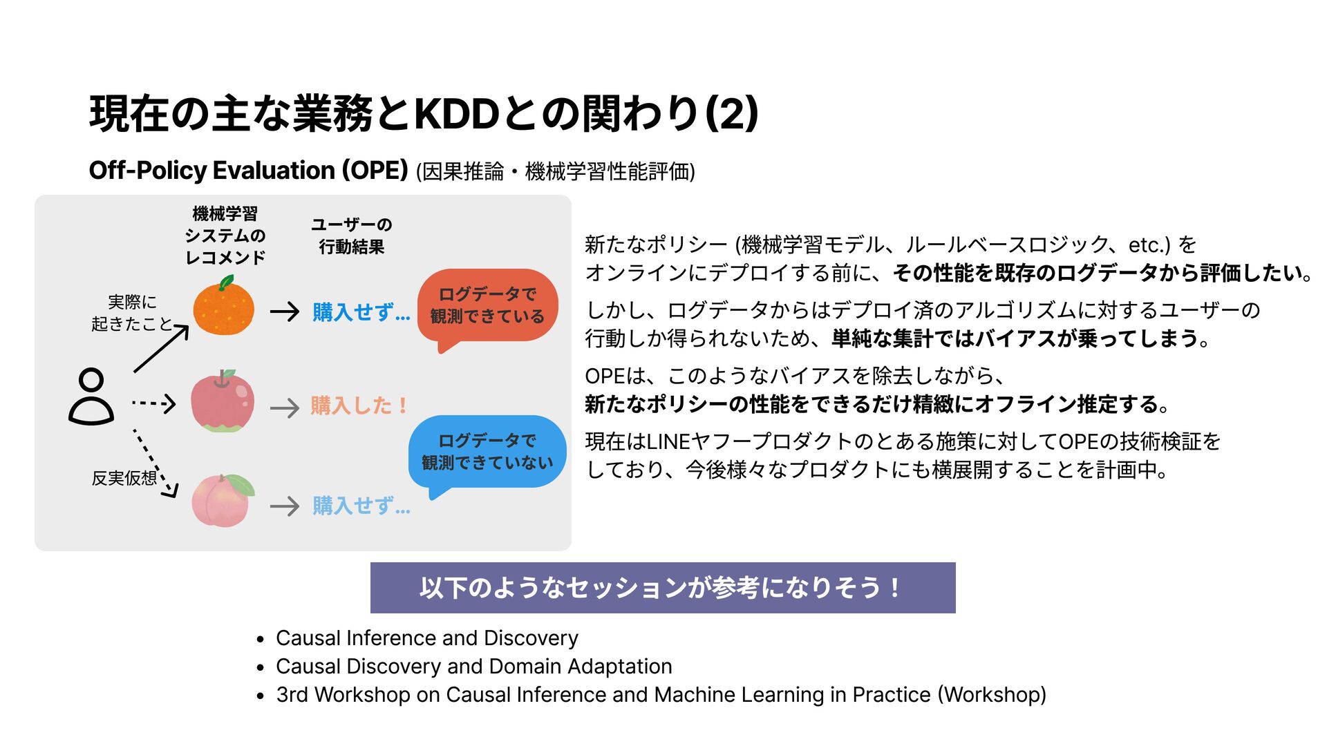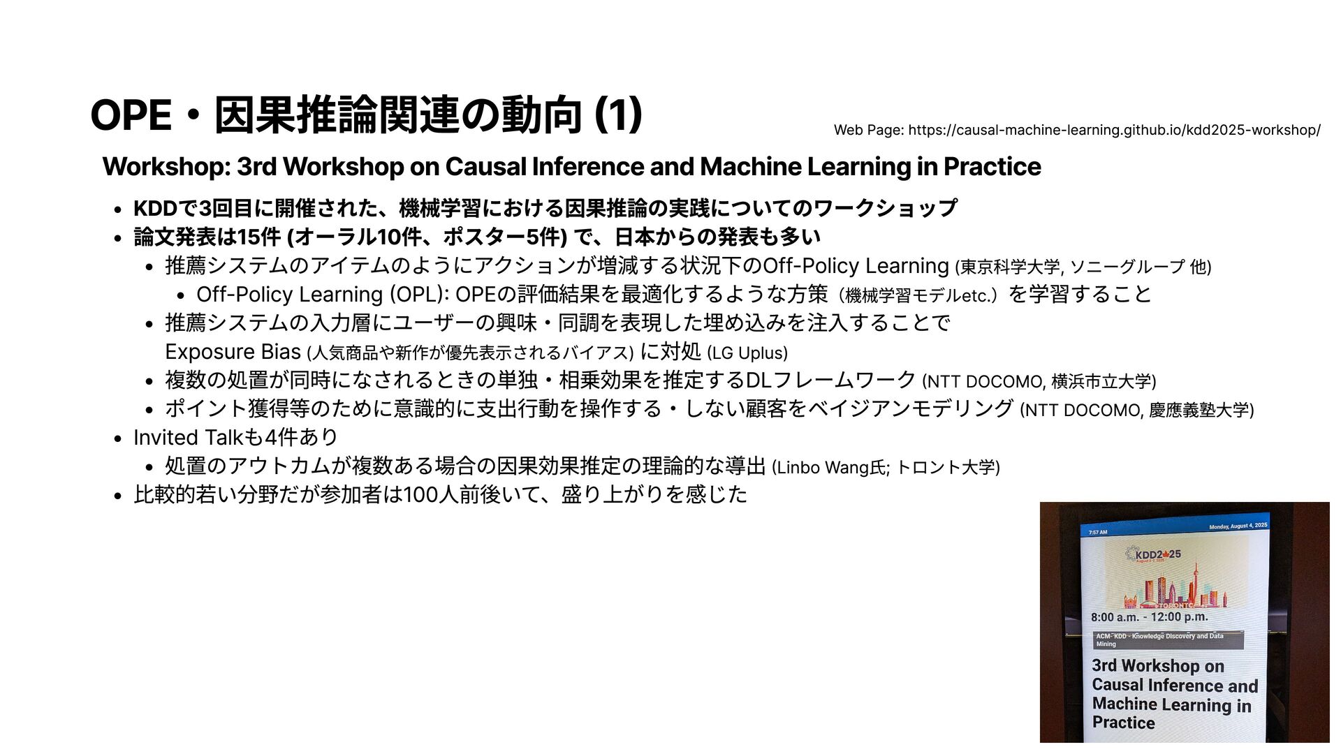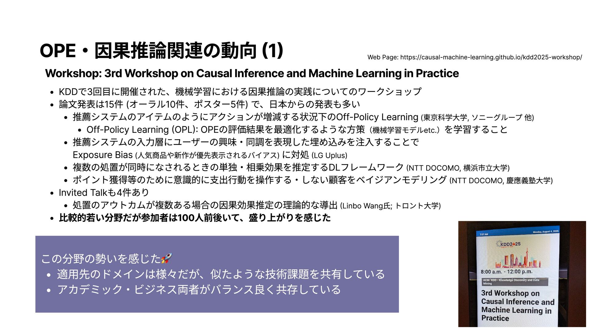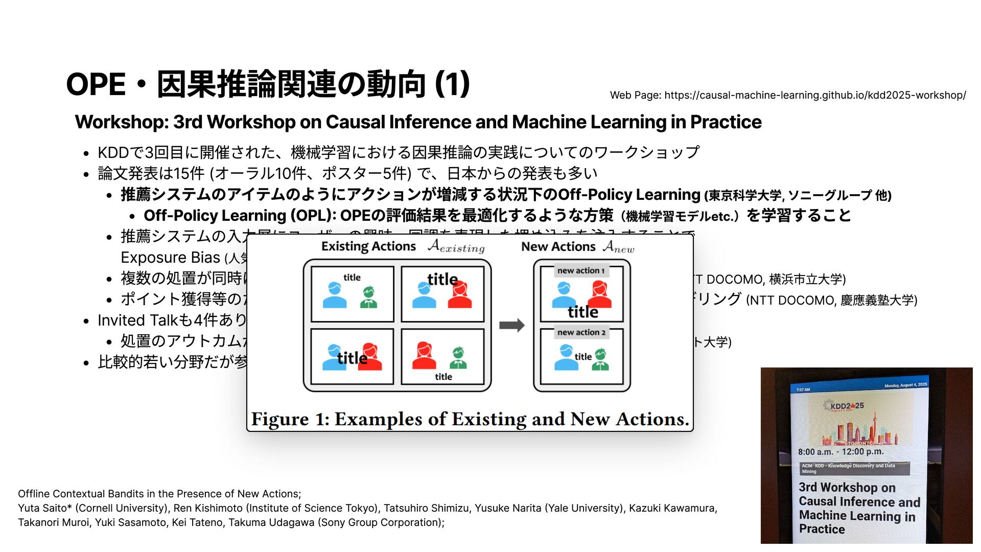 Learning in Practice KDD で3回目に開催された、機械学習における因果推論の実践についてのワークショップ 論文発表は15件 (オーラル10件、ポスター5件) で、日本からの発表も多い 推薦システムのアイテムのようにアクションが増減する状況下のOff-Policy Learning (東京科学大学, ソニーグループ 他) Off-Policy Learning (OPL): OPEの評価結果を最適化するような方策(機械学習モデルetc.)を学習すること 推薦システムの入力層にユーザーの興味・同調を表現した埋め込みを注入することで