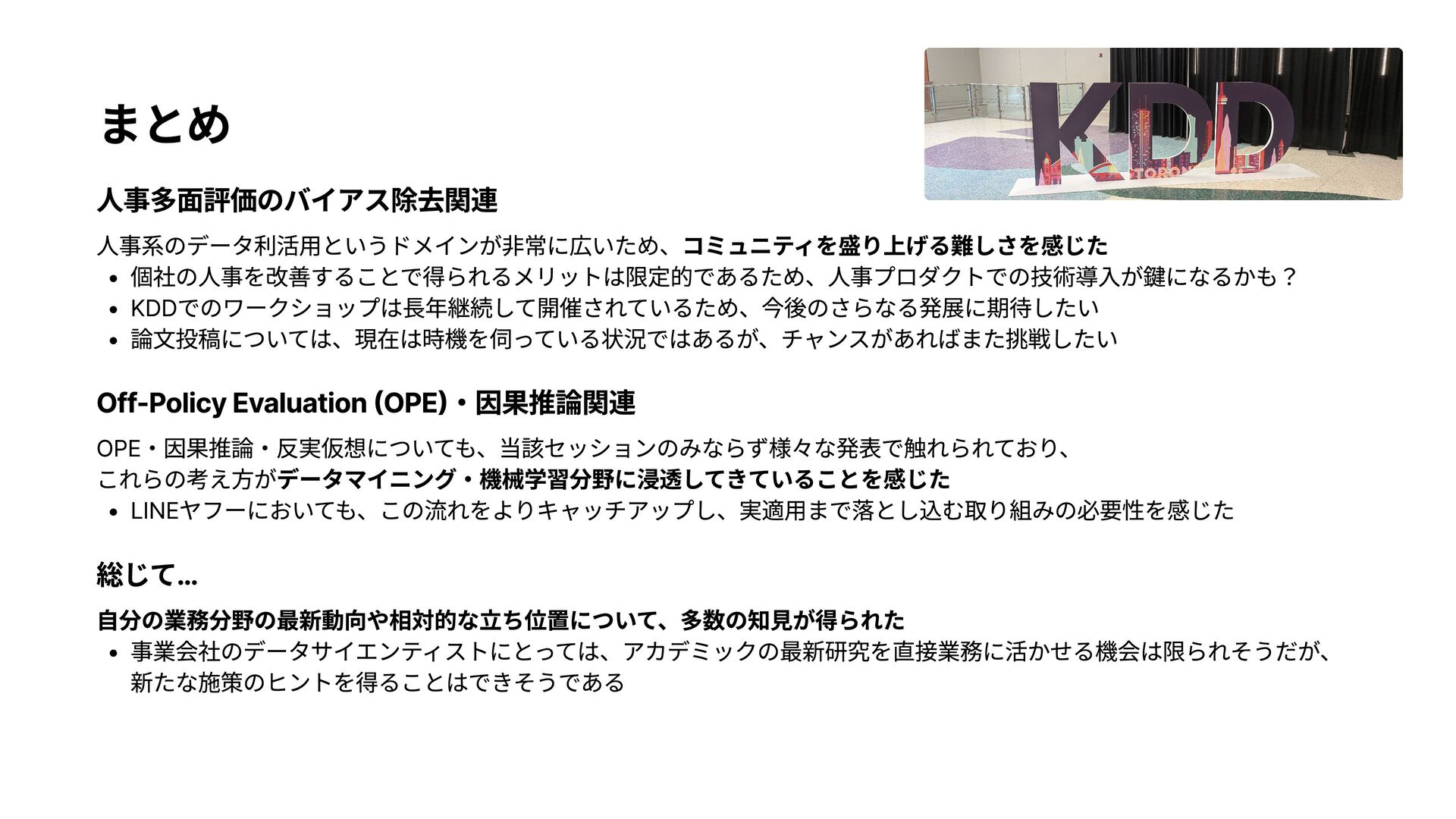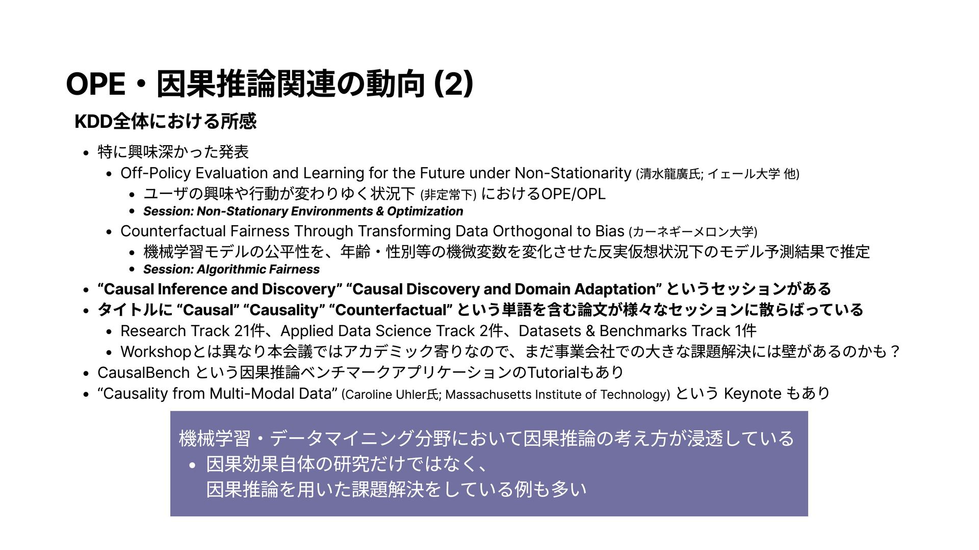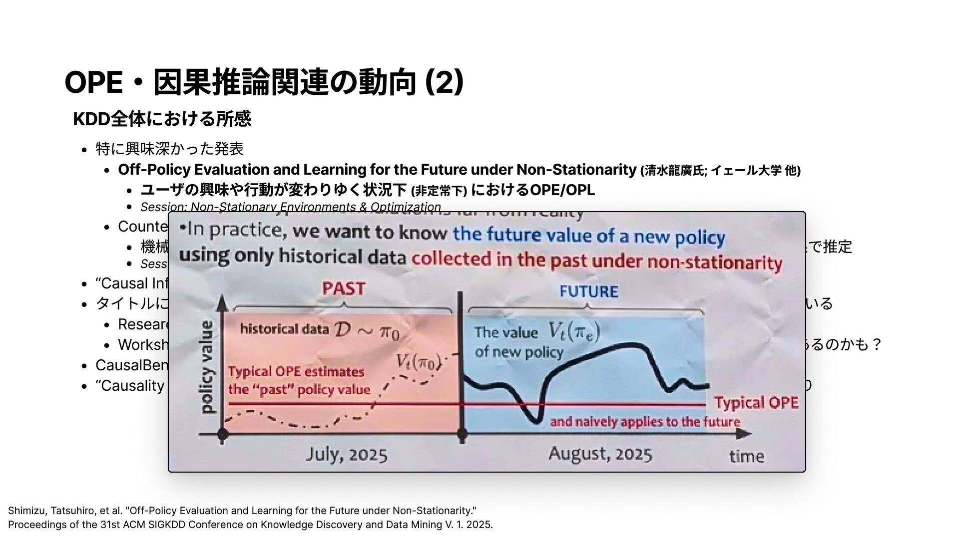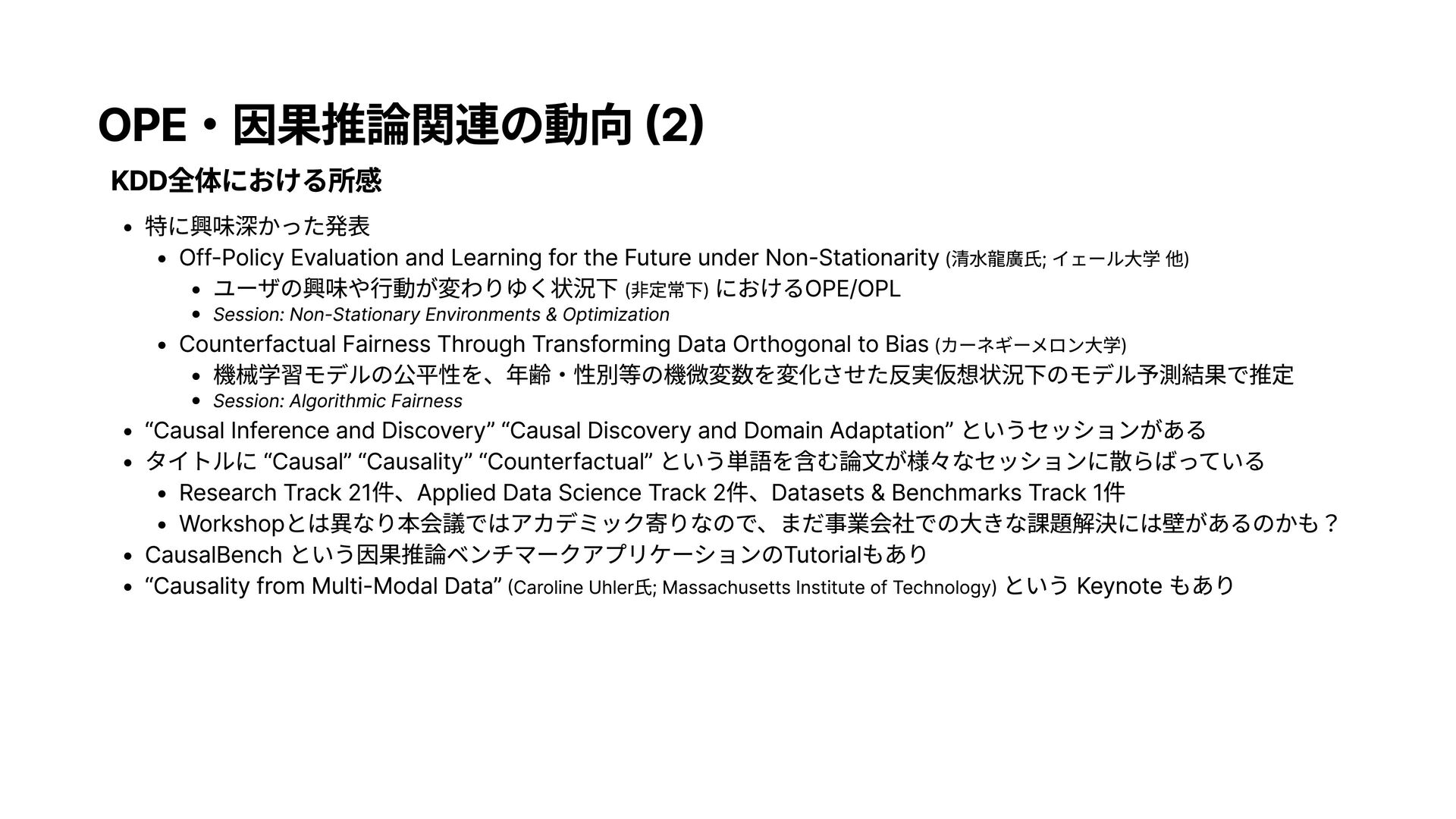 Learning in Practice KDD で3回目に開催された、機械学習における因果推論の実践についてのワークショップ 論文発表は15件 (オーラル10件、ポスター5件) で、日本からの発表も多い 推薦システムのアイテムのようにアクションが増減する状況下のOff-Policy Learning (東京科学大学, ソニーグループ 他) Off-Policy Learning (OPL): OPEの評価結果を最適化するような方策(機械学習モデルetc.)を学習すること 推薦システムの入力層にユーザーの興味・同調を表現した埋め込みを注入することで