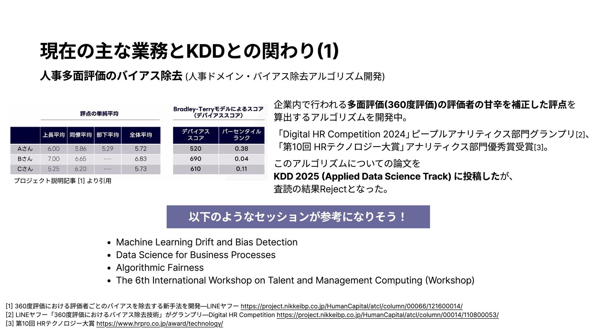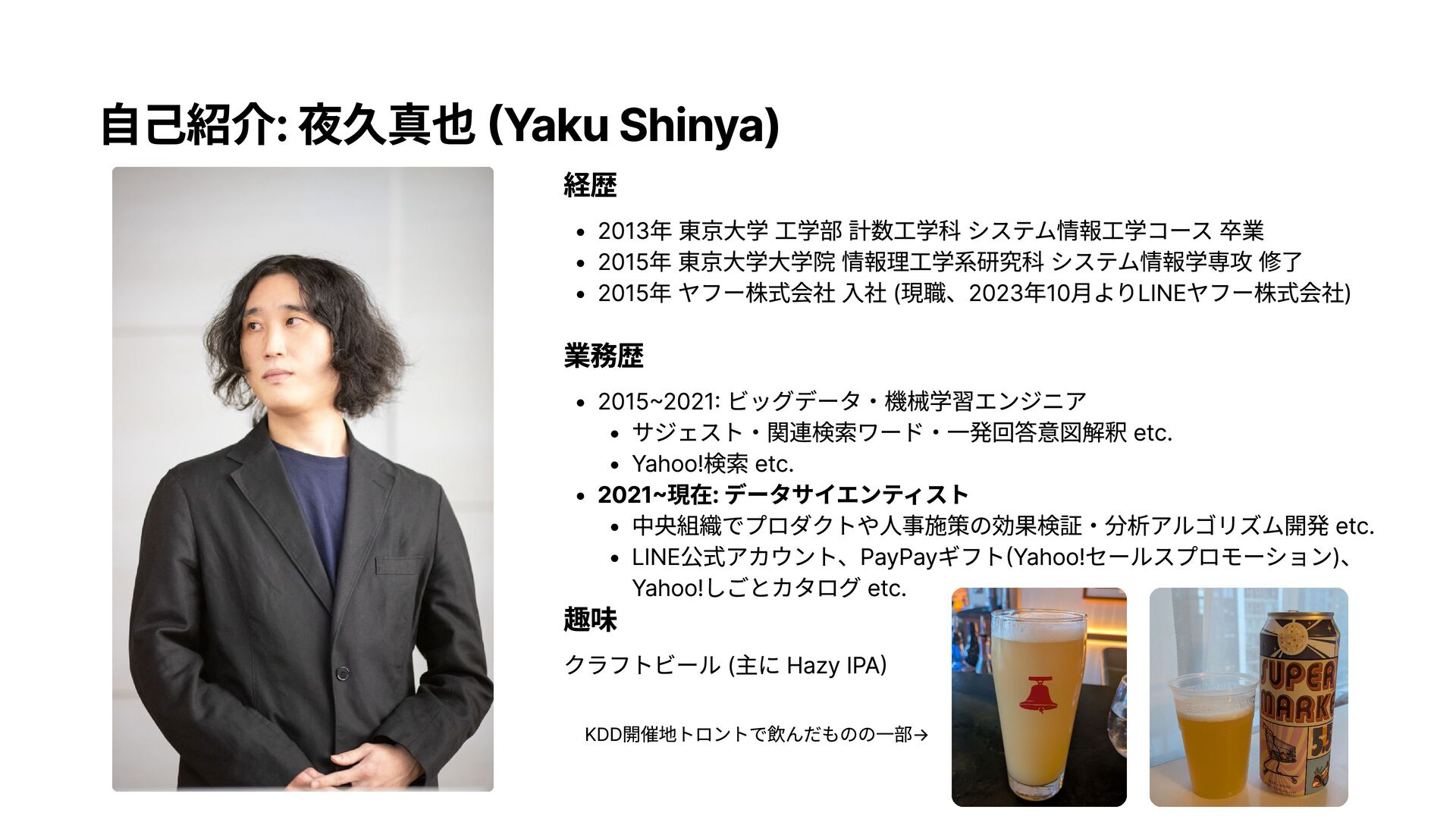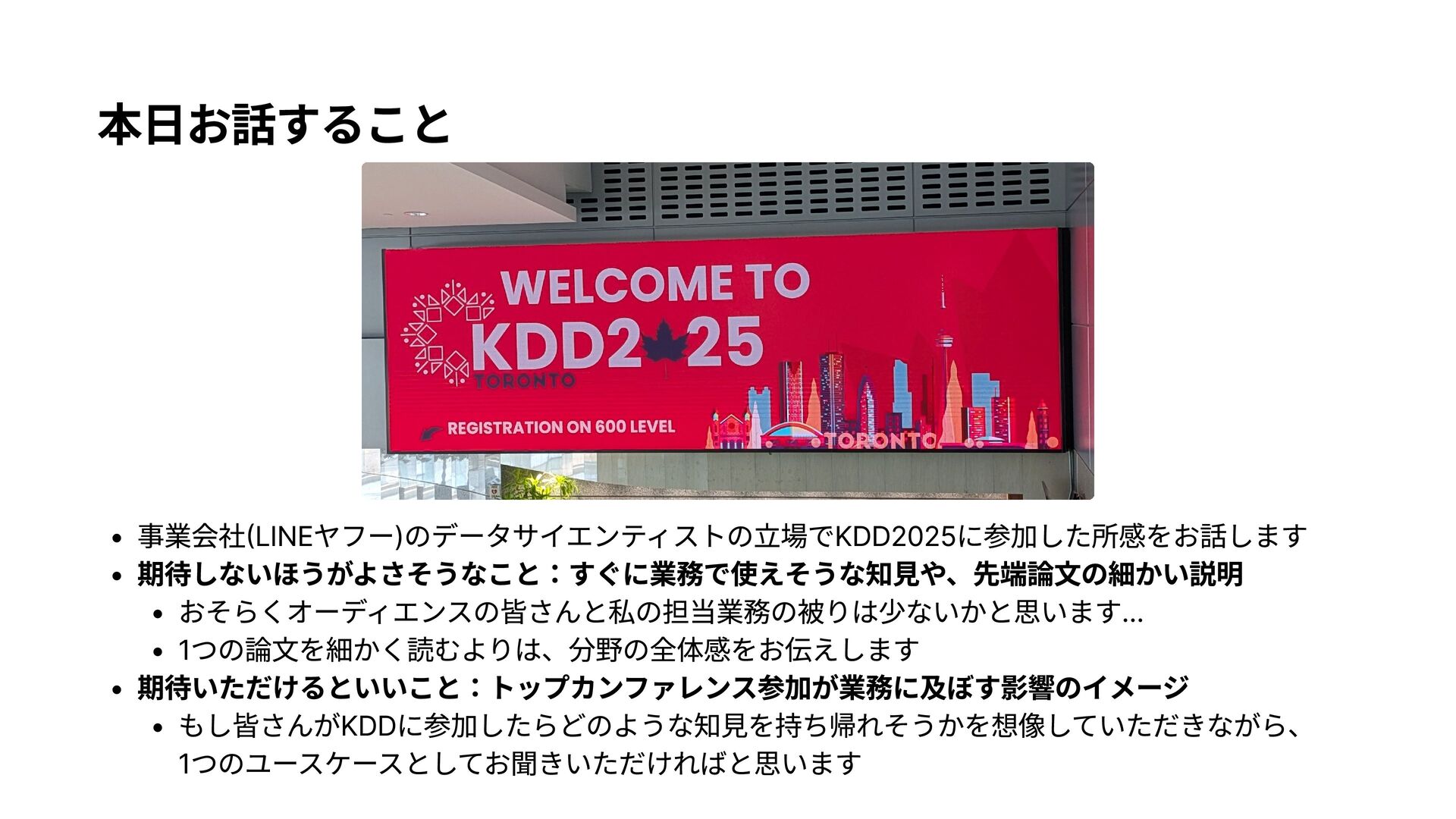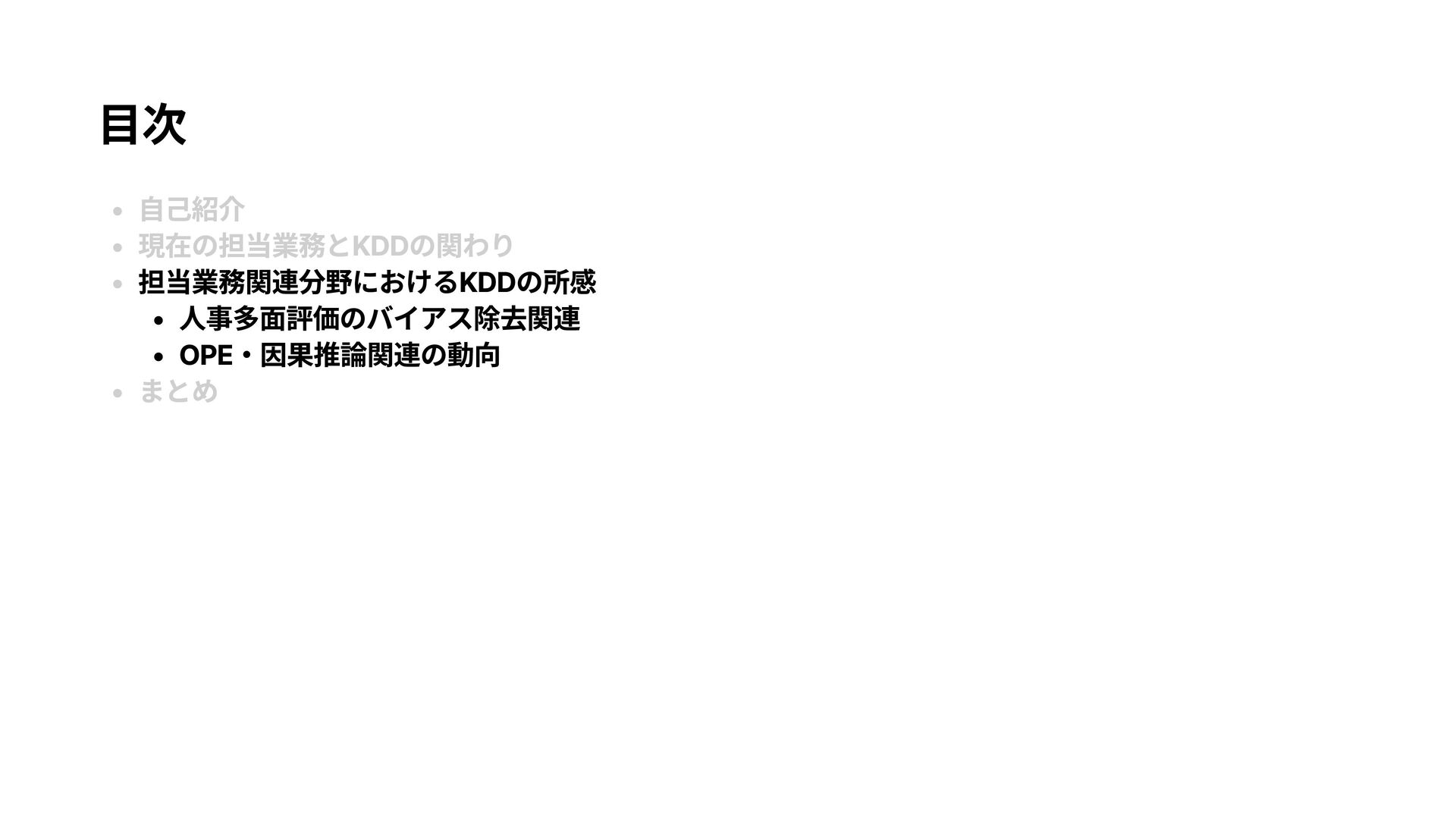 Learning in Practice KDD で3回目に開催された、機械学習における因果推論の実践についてのワークショップ 論文発表は15件 (オーラル10件、ポスター5件) で、日本からの発表も多い 推薦システムのアイテムのようにアクションが増減する状況下のOff-Policy Learning (東京科学大学, ソニーグループ 他) Off-Policy Learning (OPL): OPEの評価結果を最適化するような方策(機械学習モデルetc.)を学習すること 推薦システムの入力層にユーザーの興味・同調を表現した埋め込みを注入することで