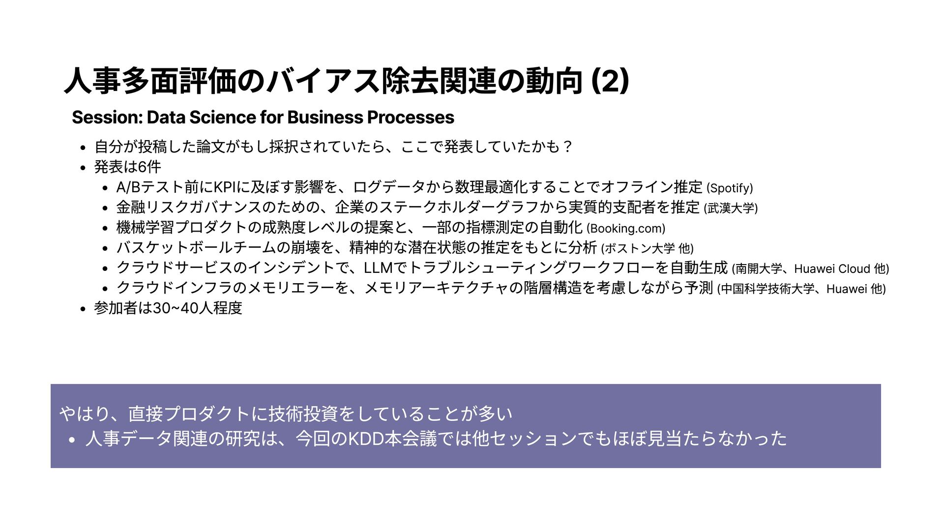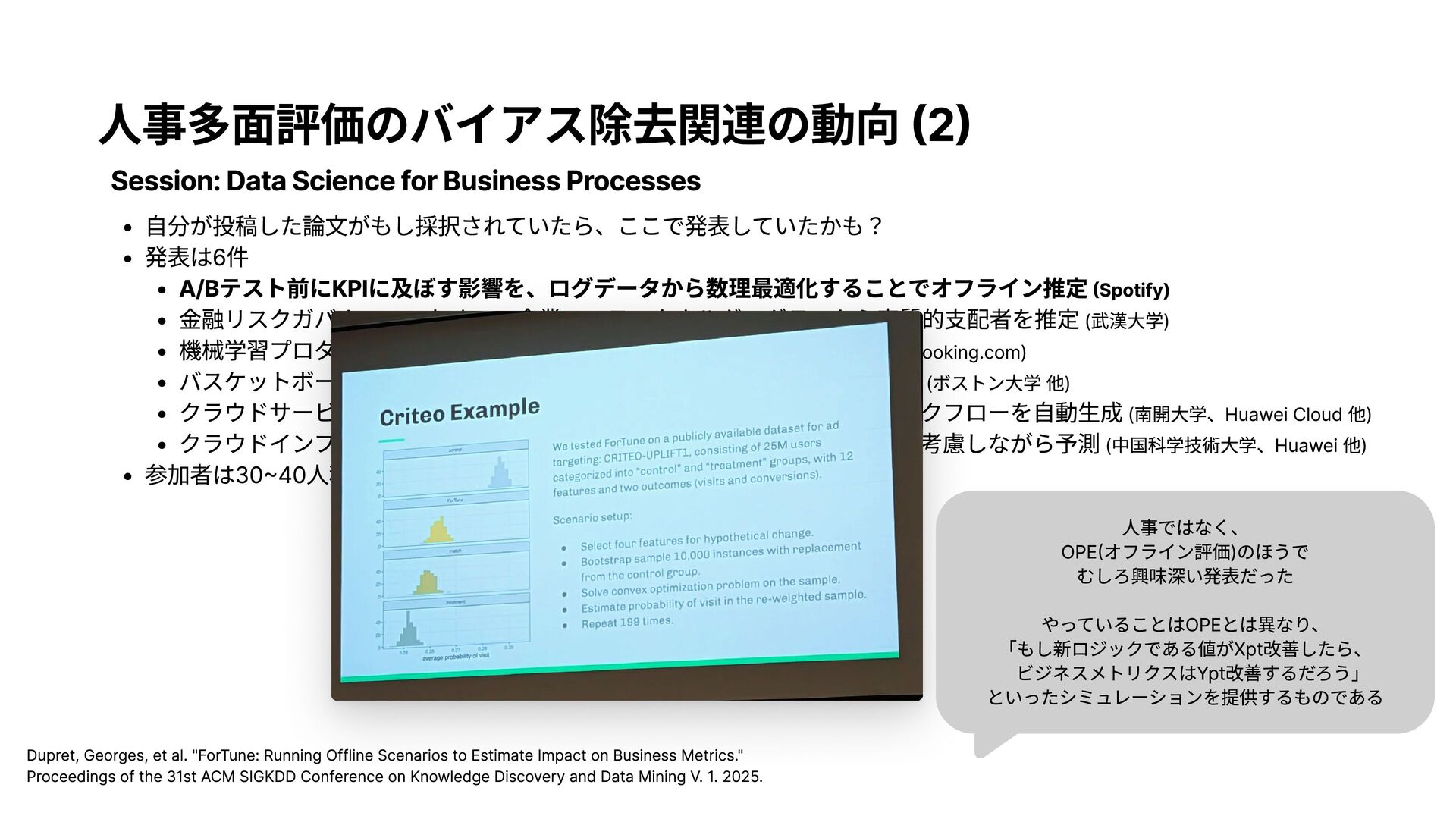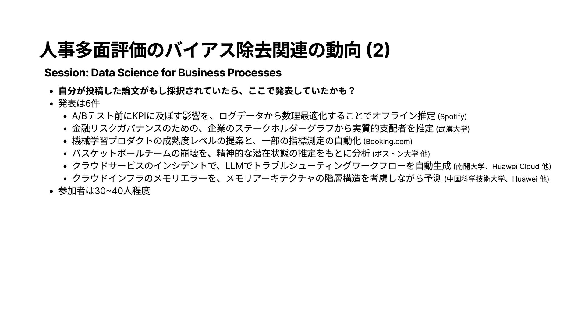 Exposure Bias (人気商品や新作が優先表示されるバイアス) に対処 (LG Uplus) 複数の処置が同時になされるときの単独・相乗効果を推定するDLフレームワーク (NTT DOCOMO, 横浜市立大学) ポイント獲得等のために意識的に支出行動を操作する・しない顧客をベイジアンモデリング (NTT DOCOMO, 慶應義塾大学) Invited Talkも4件あり 処置のアウトカムが複数ある場合の因果効果推定の理論的な導出 (Linbo Wang氏; トロント大学) 比較的若い分野だが参加者は100人前後いて、盛り上がりを感じた Offline Contextual Bandits in the Presence of New Actions;