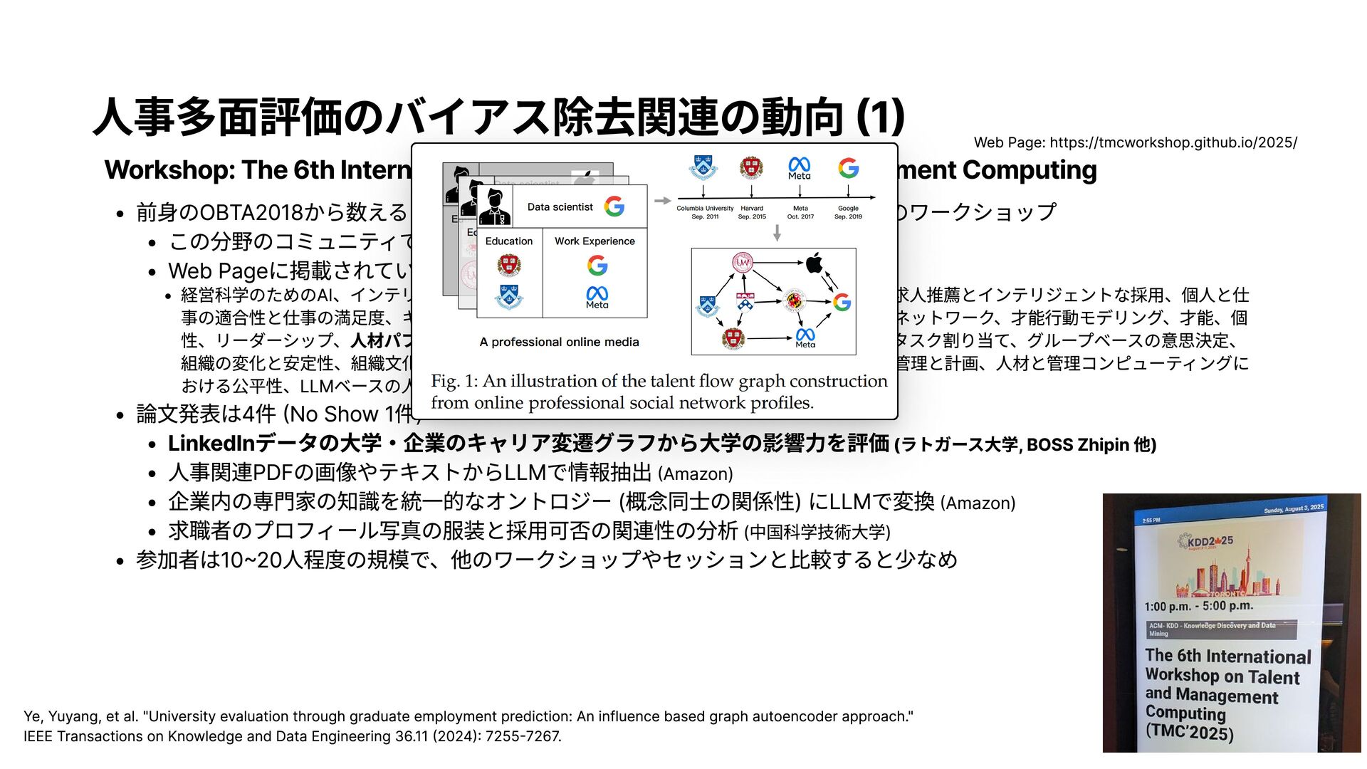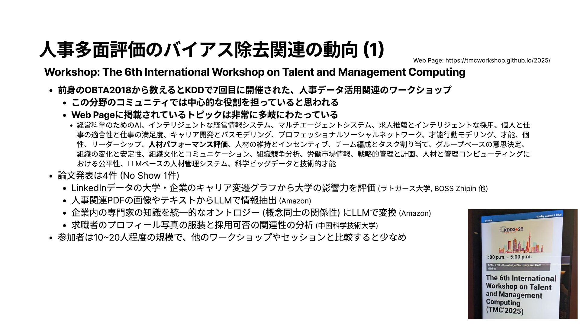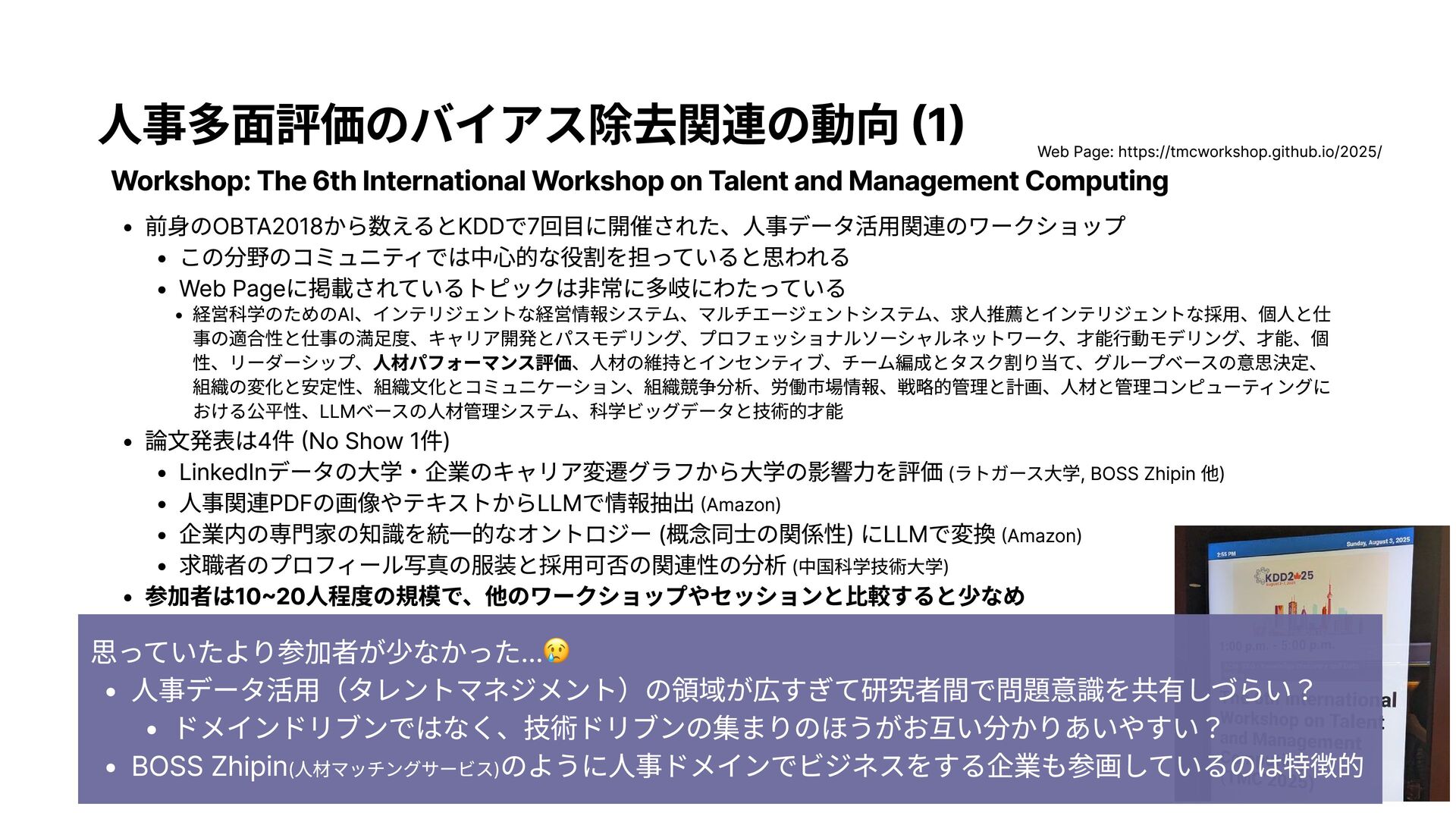 Exposure Bias (人気商品や新作が優先表示されるバイアス) に対処 (LG Uplus) 複数の処置が同時になされるときの単独・相乗効果を推定するDLフレームワーク (NTT DOCOMO, 横浜市立大学) ポイント獲得等のために意識的に支出行動を操作する・しない顧客をベイジアンモデリング (NTT DOCOMO, 慶應義塾大学) Invited Talkも4件あり 処置のアウトカムが複数ある場合の因果効果推定の理論的な導出 (Linbo Wang氏; トロント大学) 比較的若い分野だが参加者は100人前後いて、盛り上がりを感じた Offline Contextual Bandits in the Presence of New Actions;