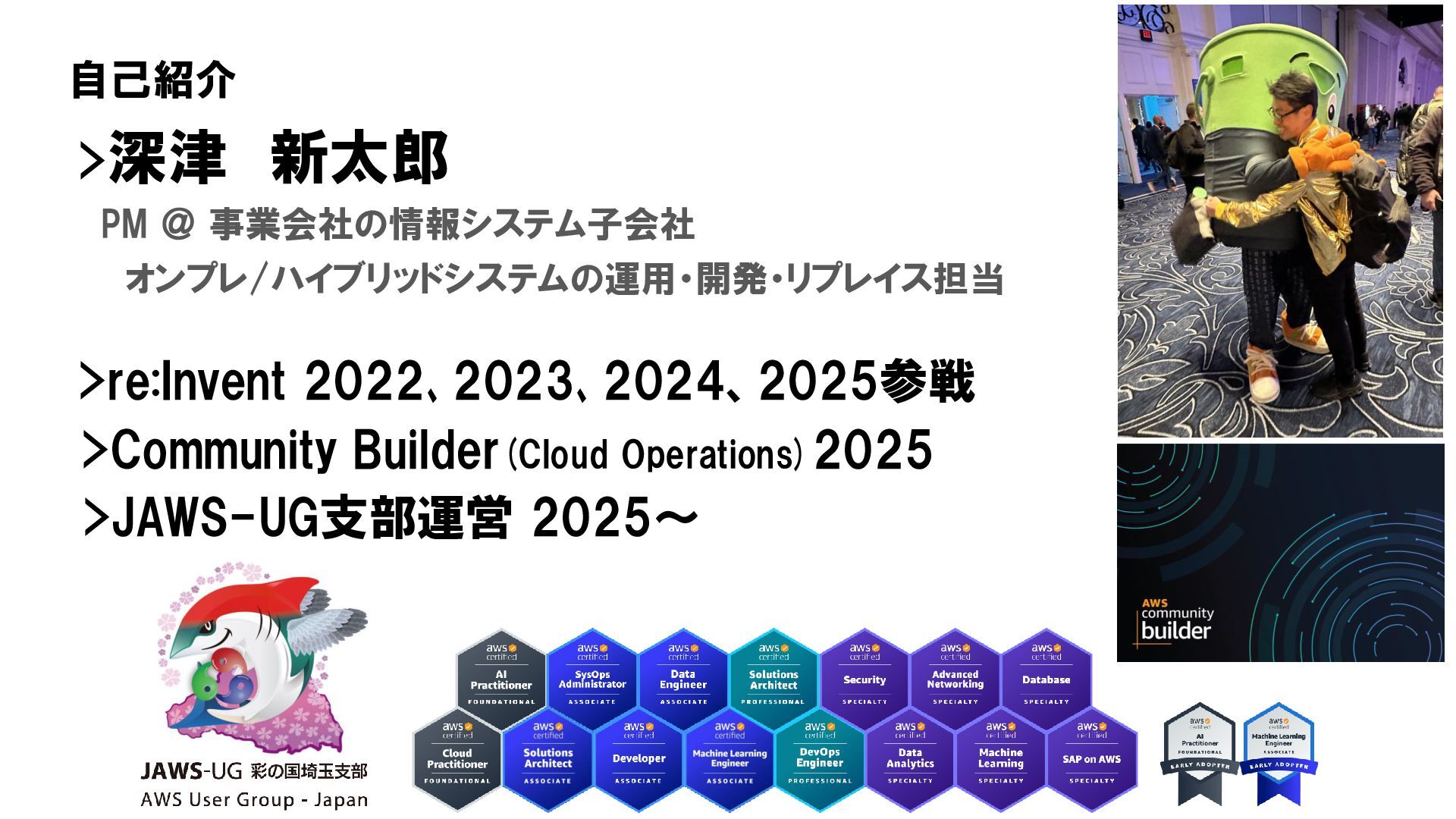 自己紹介 >深津 新太郎 PM @ 事業会社の情報システム子会社 オンプレ/ハイブリッドシステムの運用・開発・リプレイス担当 >re:Invent 2022、2023、2024、2025参戦 >Community