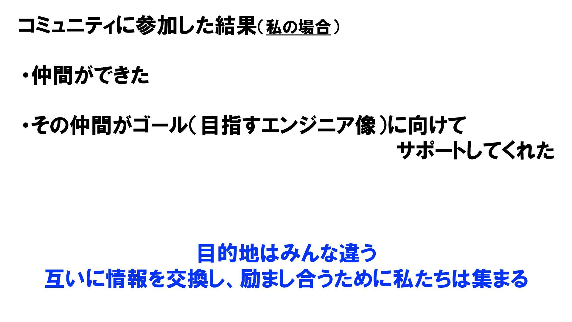 コミュニティに参加した結果(私の場合) ・仲間ができた 目的地はみんな違う 互いに情報を交換し、励まし合うために私たちは集まる ・その仲間がゴール(目指すエンジニア像)に向けて サポートしてくれた
