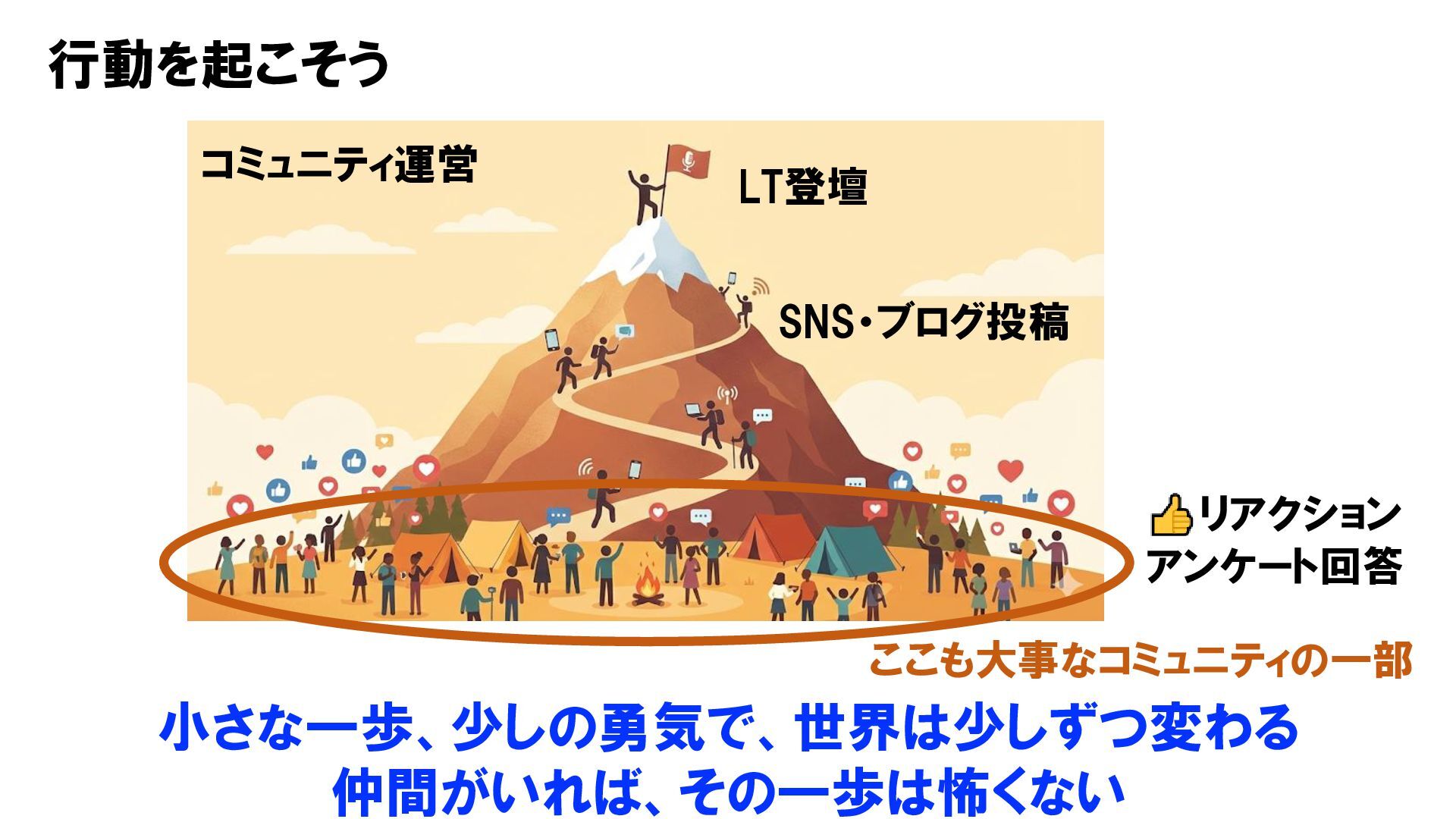 行動を起こそう 小さな一歩、少しの勇気で、世界は少しずつ変わる 仲間がいれば、その一歩は怖くない LT登壇 SNS・ブログ投稿 リアクション アンケート回答 ここも大事なコミュニティの一部 コミュニティ運営