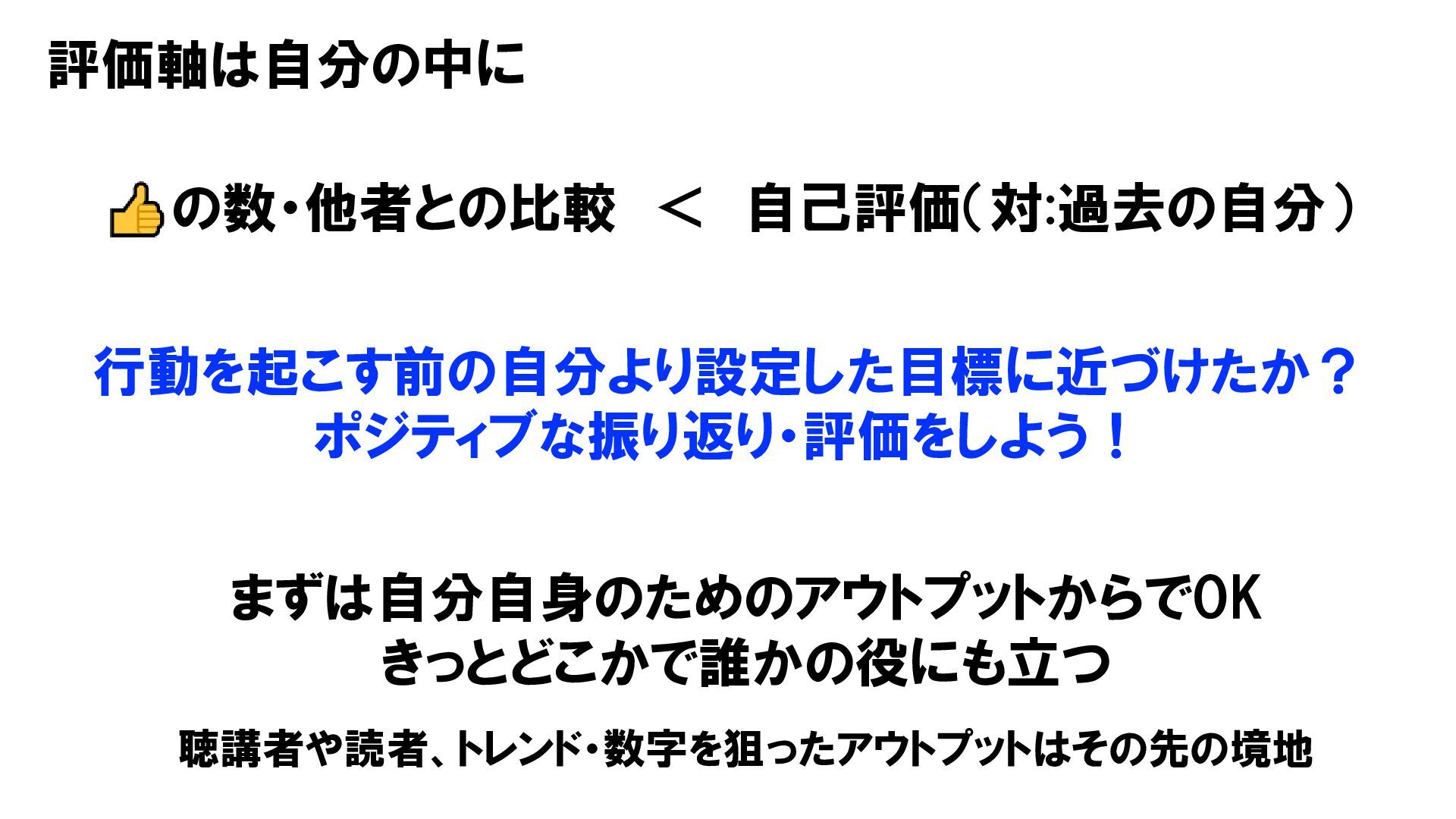 評価軸は自分の中に の数・他者との比較 < 自己評価(対:過去の自分) 行動を起こす前の自分より設定した目標に近づけたか? ポジティブな振り返り・評価をしよう! まずは自分自身のためのアウトプットからでOK きっとどこかで誰かの役にも立つ 聴講者や読者、トレンド・数字を狙ったアウトプットはその先の境地
