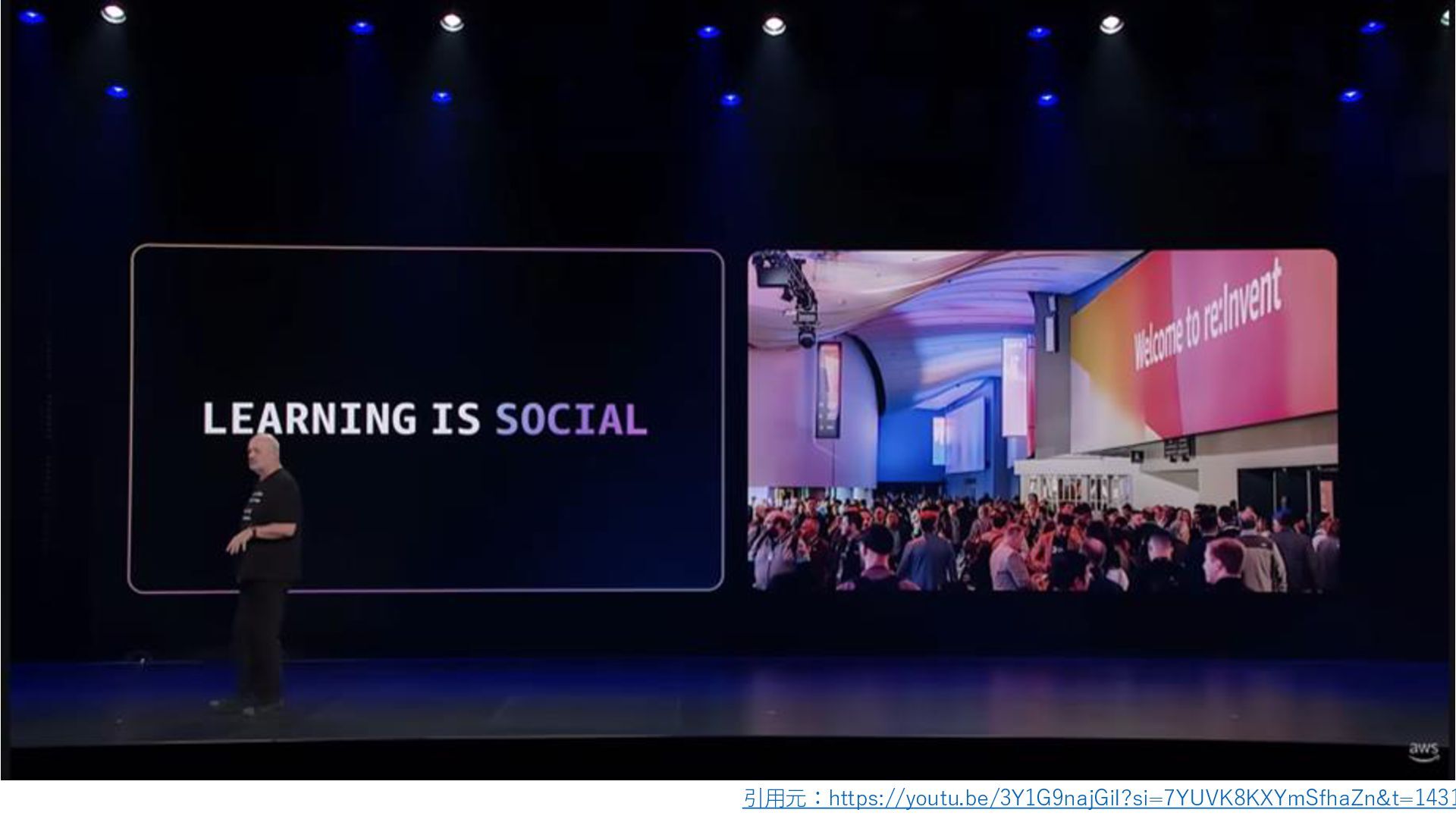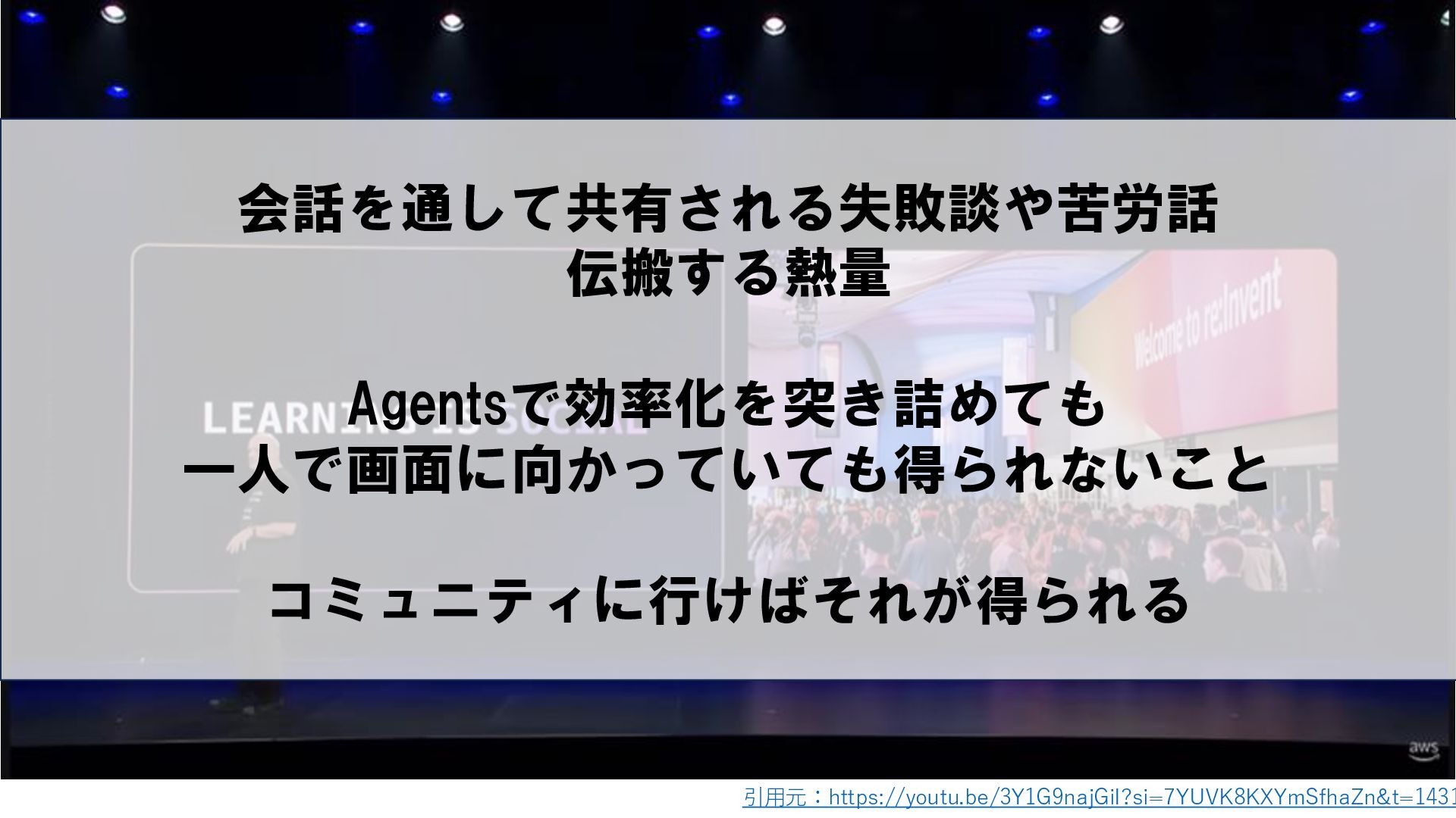 引用元:https://youtu.be/3Y1G9najGiI?si=7YUVK8KXYmSfhaZn&t=1431 会話を通して共有される失敗談や苦労話 伝搬する熱量 Agentsで効率化を突き詰めても 一人で画面に向かっていても得られないこと コミュニティに行けばそれが得られる