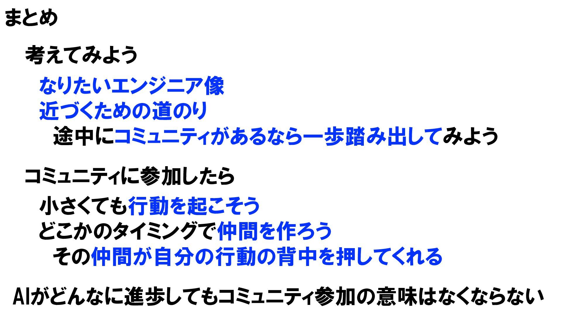 まとめ 考えてみよう コミュニティに参加したら AIがどんなに進歩してもコミュニティ参加の意味はなくならない なりたいエンジニア像 近づくための道のり 途中にコミュニティがあるなら一歩踏み出してみよう 小さくても行動を起こそう どこかのタイミングで仲間を作ろう その仲間が自分の行動の背中を押してくれる