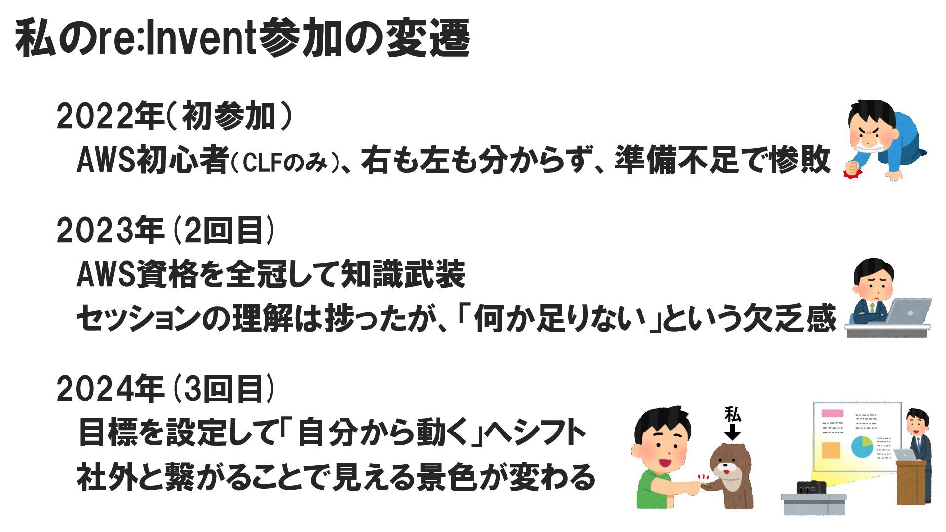2022年(初参加) AWS初心者(CLFのみ)、右も左も分からず、準備不足で惨敗 2023年(2回目) AWS資格を全冠して知識武装 セッションの理解は捗ったが、「何か足りない」という欠乏感 2024年(3回目) 目標を設定して「自分から動く」へシフト 社外と繋がることで見える景色が変わる 私のre:Invent参加の変遷 私