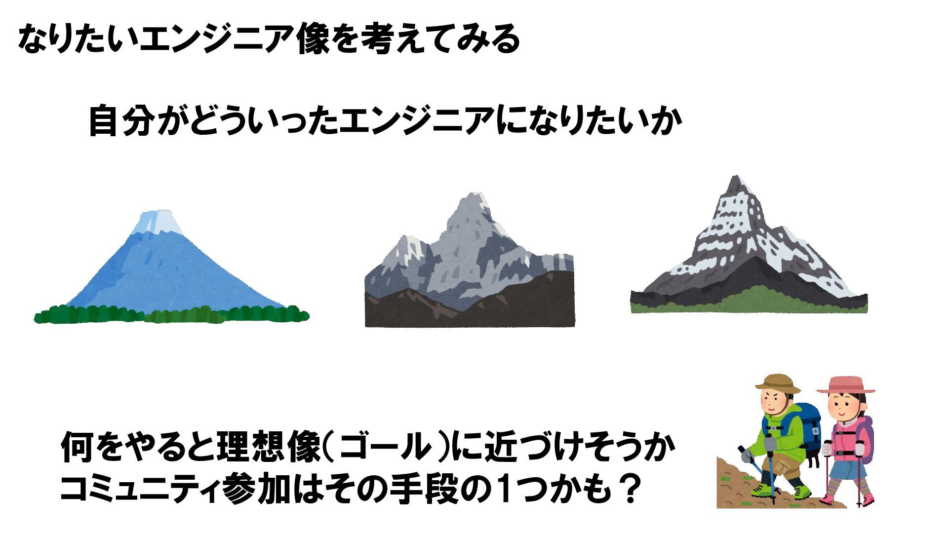 なりたいエンジニア像を考えてみる 自分がどういったエンジニアになりたいか 何をやると理想像(ゴール)に近づけそうか コミュニティ参加はその手段の1つかも?