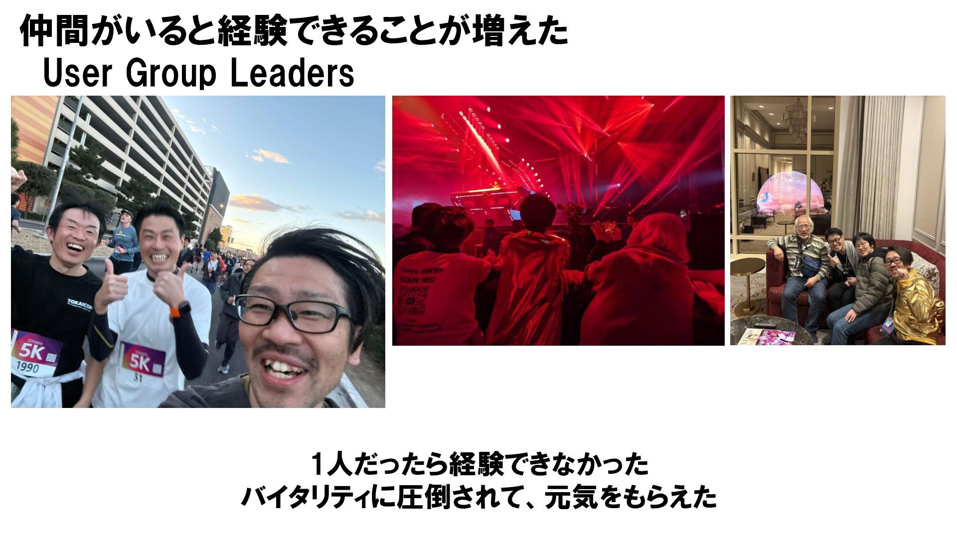 仲間がいると経験できることが増えた User Group Leaders 1人だったら経験できなかった バイタリティに圧倒されて、元気をもらえた