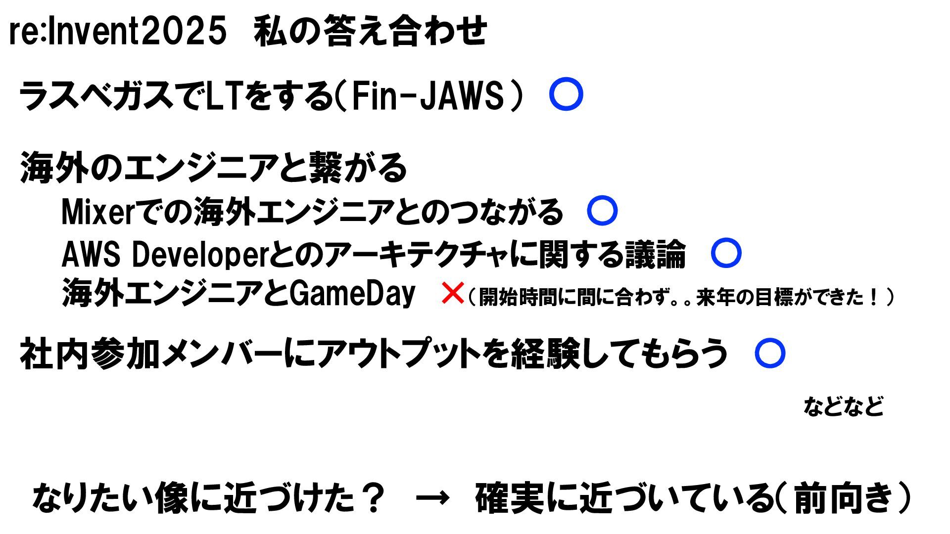 re:Invent2025 私の答え合わせ ラスベガスでLTをする(Fin-JAWS) ◦ 海外のエンジニアと繋がる Mixerでの海外エンジニアとのつながる ◦ AWS Developerとのアーキテクチャに関する議論 ◦