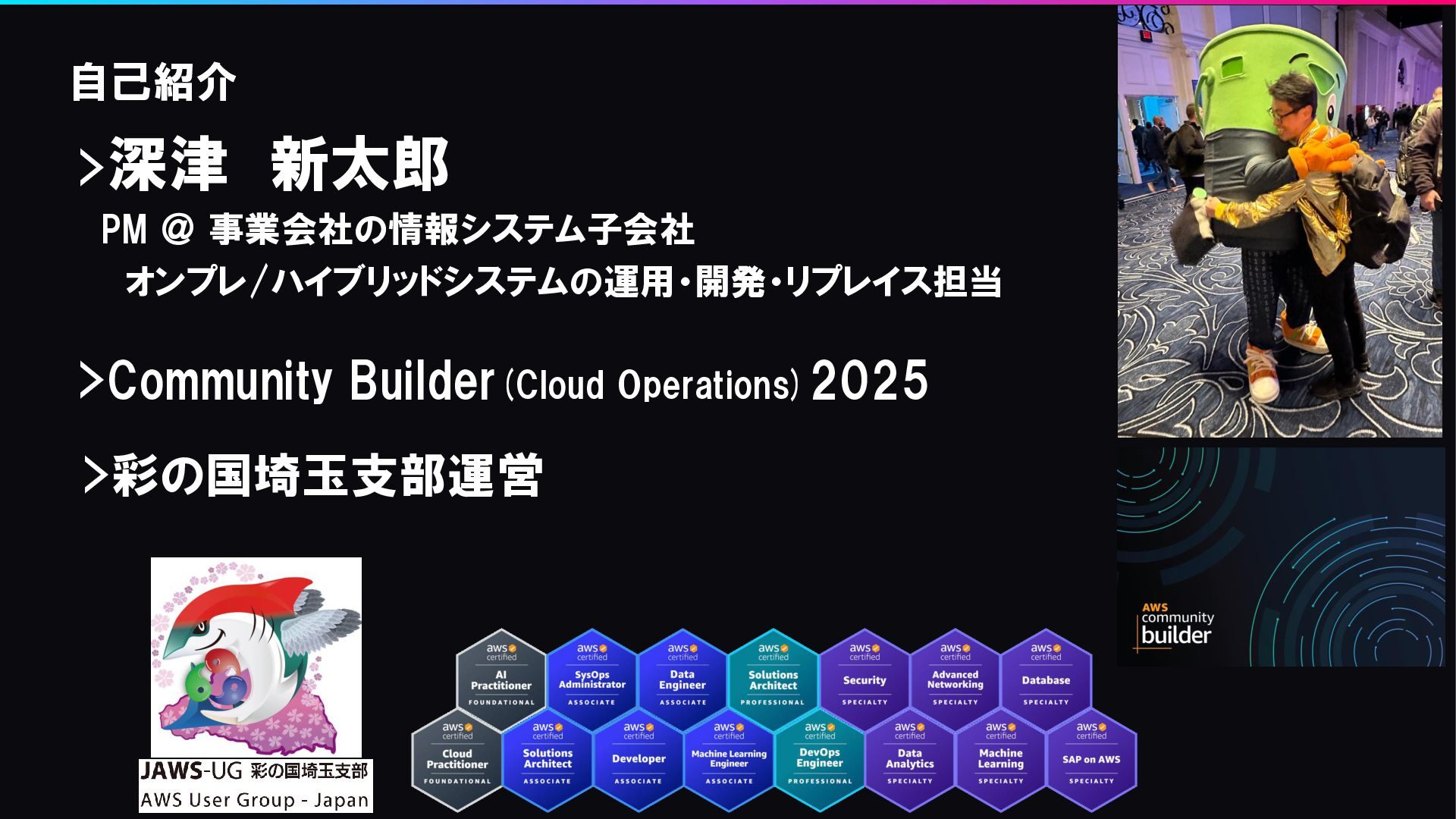 自己紹介 >深津 新太郎 PM @ 事業会社の情報システム子会社 オンプレ/ハイブリッドシステムの運用・開発・リプレイス担当 >Community Builder(Cloud Operations)2025