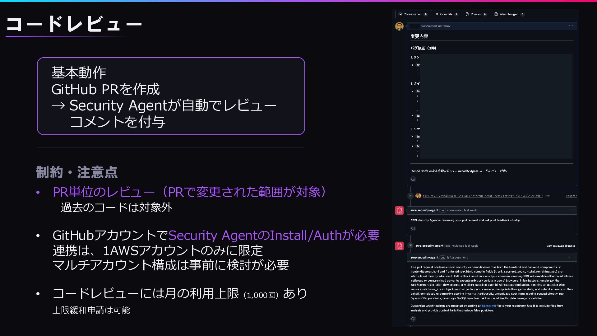 過去のコードは対象外 • GitHubアカウントでSecurity AgentのInstall/Authが必要 連携は、1AWSアカウントのみに限定 マルチアカウント構成は事前に検討が必要 • コードレビューには月の利用上限(1,000回) あり 上限緩和申請は可能 コードレビュー