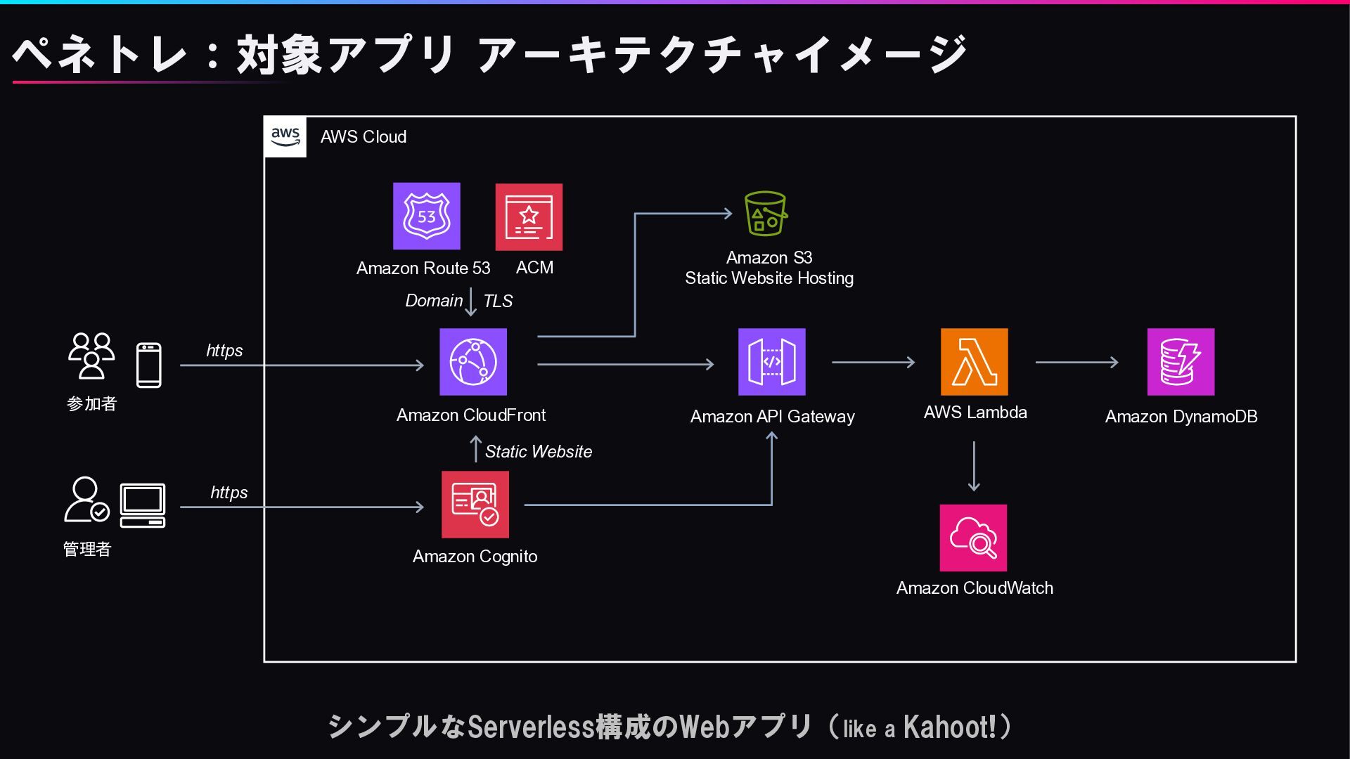 シンプルなServerless構成のWebアプリ(like a Kahoot!) ペネトレ:対象アプリ アーキテクチャイメージ 参加者 https AWS Cloud AWS