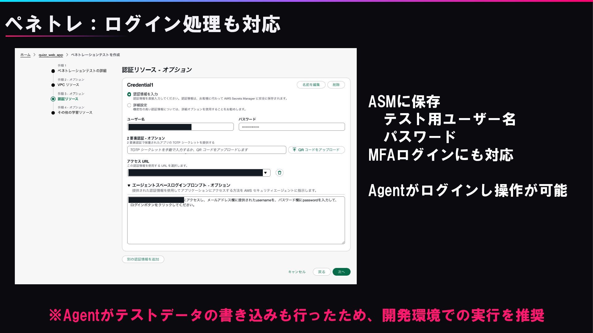 ペネトレ:ログイン処理も対応 ※Agentがテストデータの書き込みも行ったため、開発環境での実行を推奨 ASMに保存 テスト用ユーザー名 パスワード MFAログインにも対応 Agentがログインし操作が可能