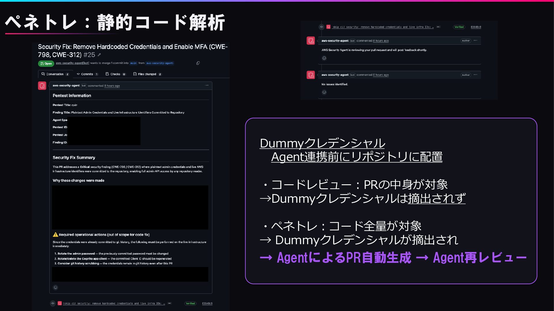 → AgentによるPR自動生成 → Agent再レビュー ペネトレ:静的コード解析 Dummyクレデンシャル Agent連携前にリポジトリに配置 ・コードレビュー:PRの中身が対象 →Dummyクレデンシャルは摘出されず ・ペネトレ:コード全量が対象
