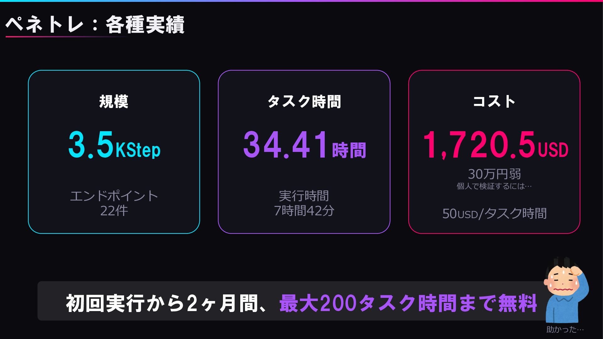 規模 3.5KStep タスク時間 34.41時間 コスト 1,720.5USD 初回実行から2ヶ月間、最大200タスク時間まで無料 ペネトレ:各種実績 エンドポイント 22件