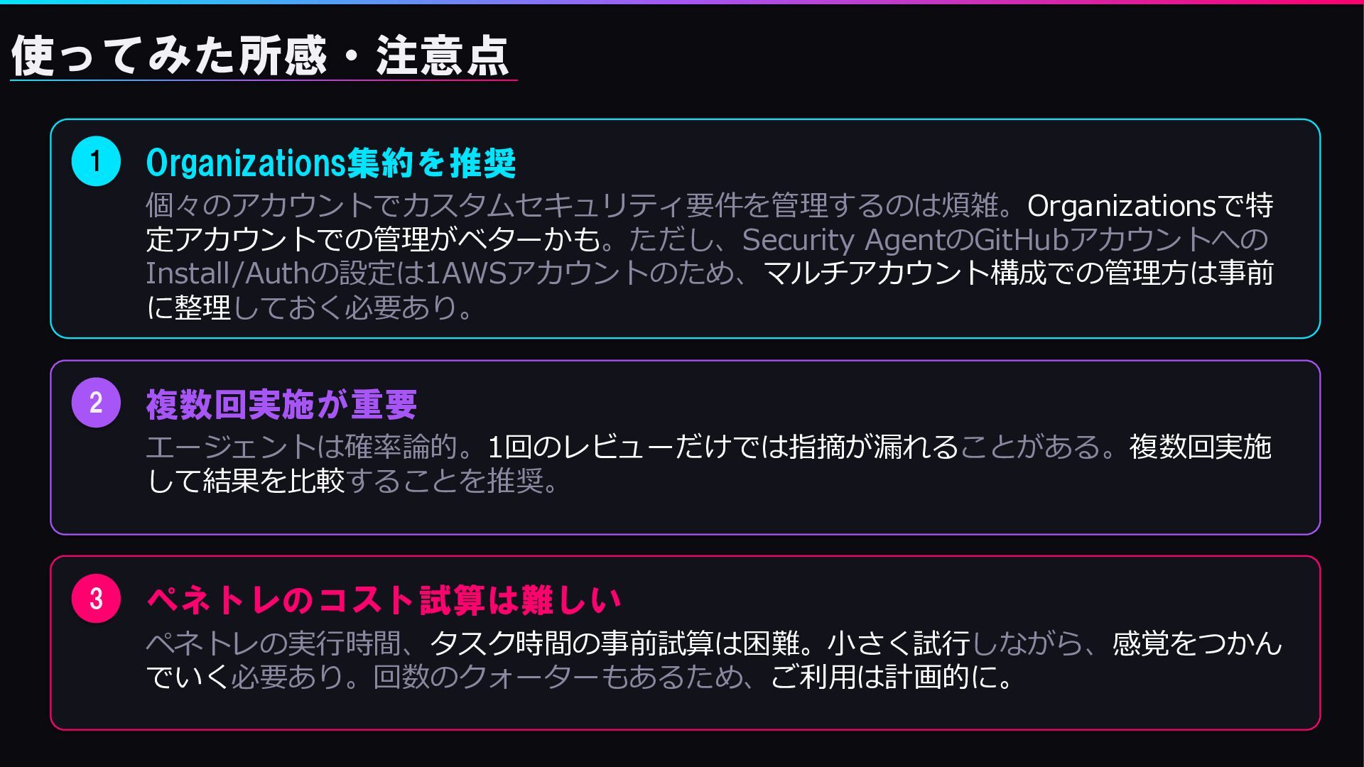 1 Organizations集約を推奨 個々のアカウントでカスタムセキュリティ要件を管理するのは煩雑。Organizationsで特 定アカウントでの管理がベターかも。ただし、Security AgentのGitHubアカウントへの Install/Authの設定は1AWSアカウントのため、マルチアカウント構成での管理方は事前 に整理しておく必要あり。 2 複数回実施が重要 エージェントは確率論的。1回のレビューだけでは指摘が漏れることがある。複数回実施